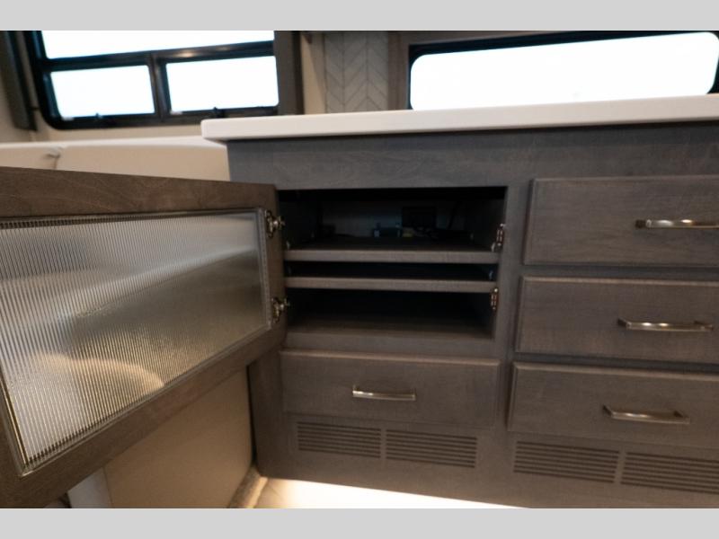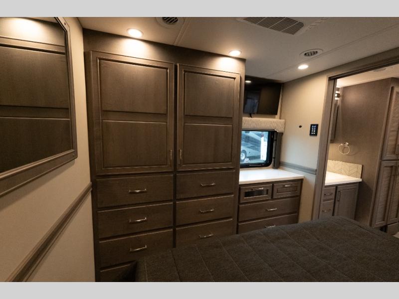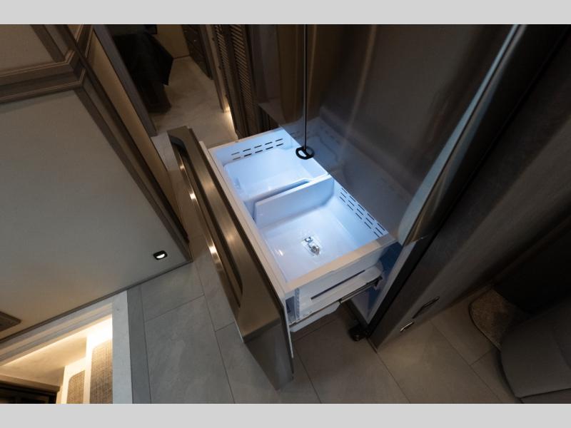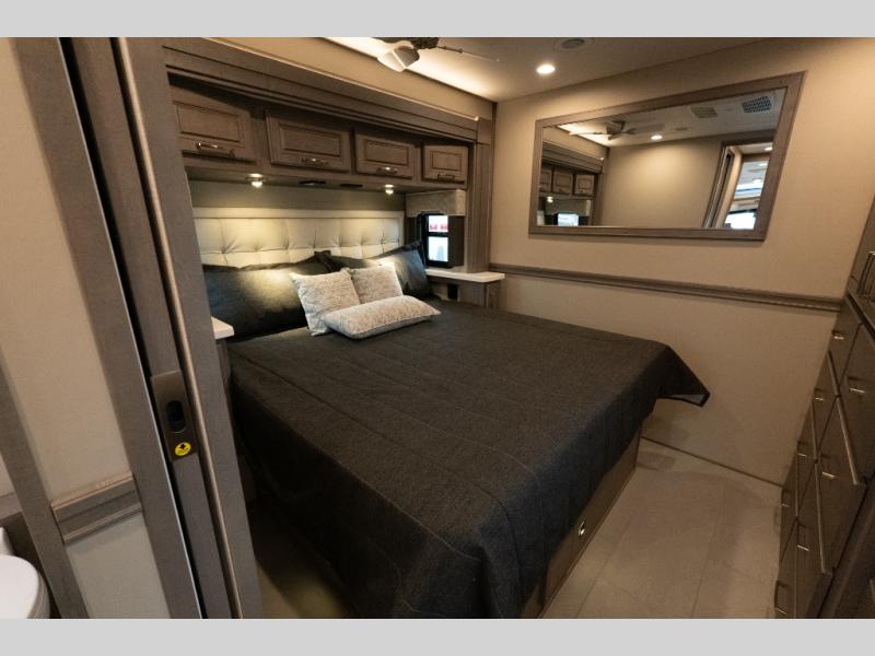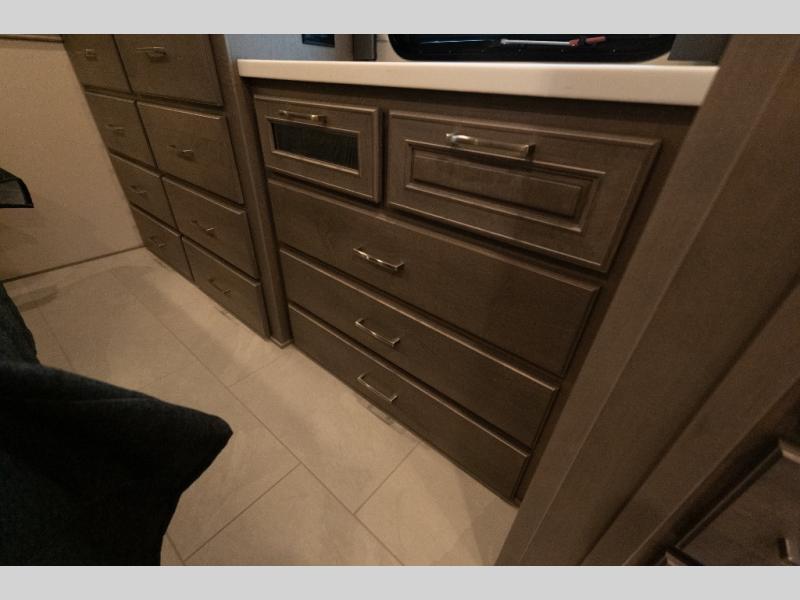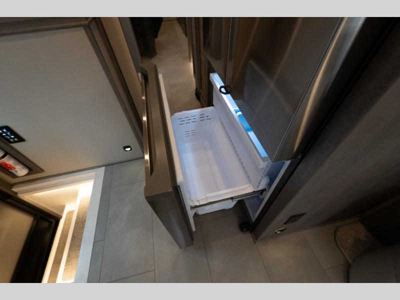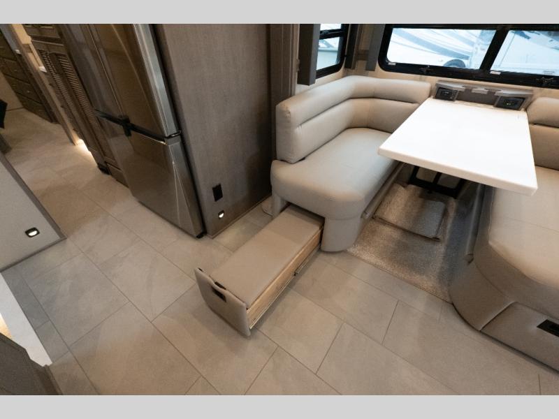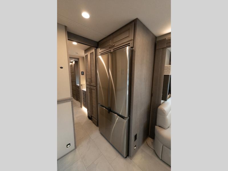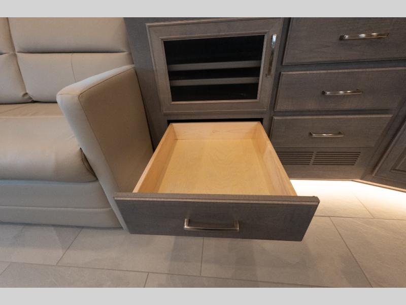 This family-friendly coach offers sleeping space for six when you convert the hide-a-bed sofa, the second sofa and the booth dinette. The triple slides open up the living area and bedroom giving everyone lots of floor space to move about during the day and at night. The rear bedroom offers a memory foam mattress, a wardrobe and a 32" Smart LED TV. You will surely appreciate the split-style bathroom when trying to quickly get ready to shop in town or prepare for bed. You can make meals for everyone using the recessed two burner induction cooktop and convection microwave, and will also appreciate 18 cu. ft. French door residential refrigerator with stainless steel doors.