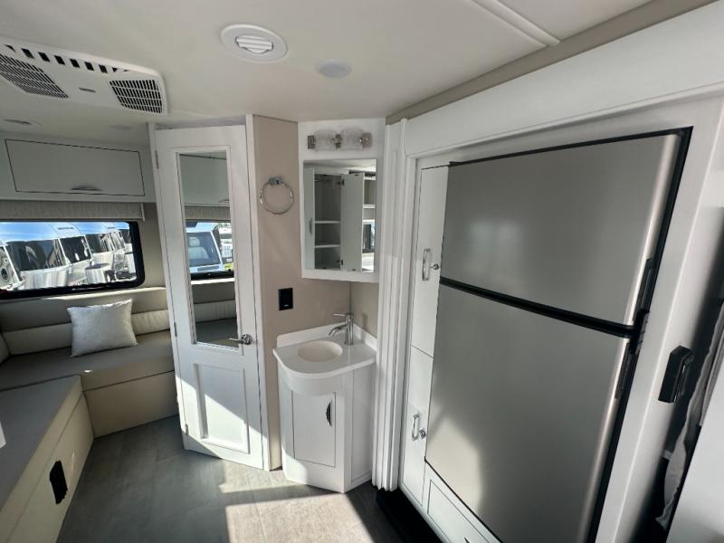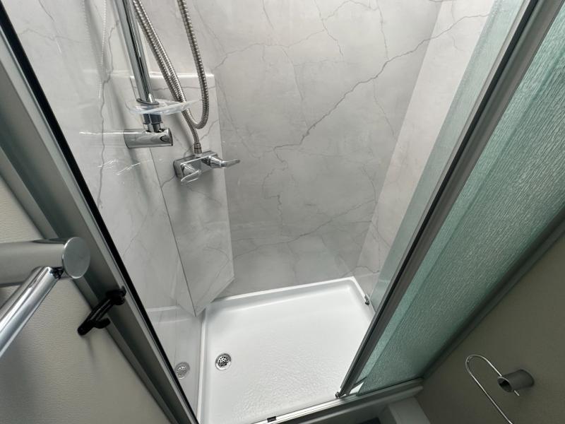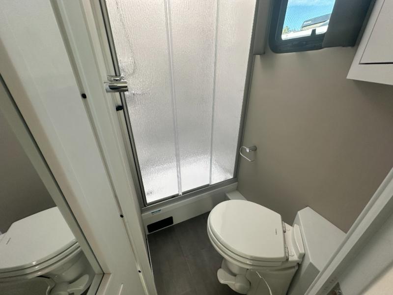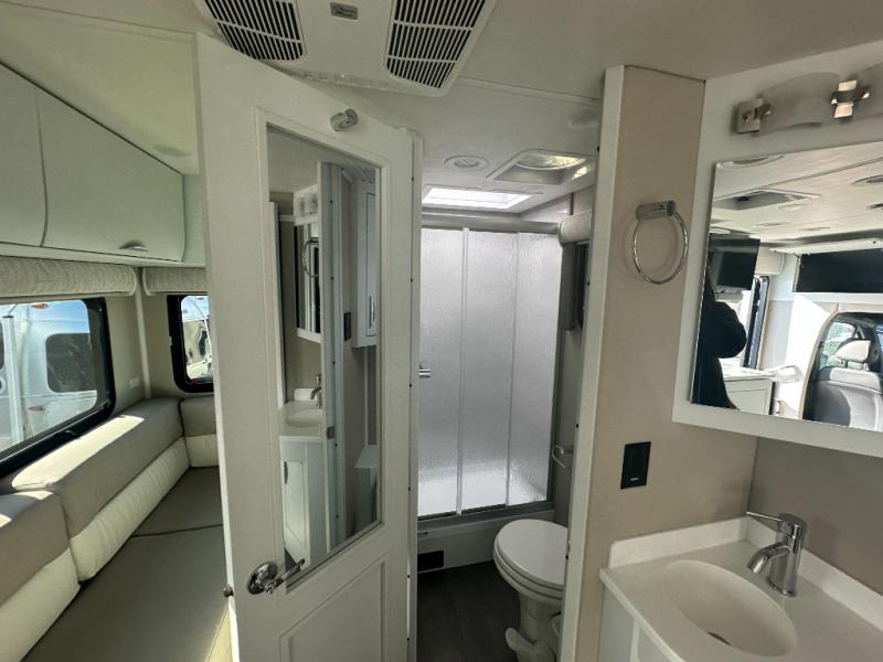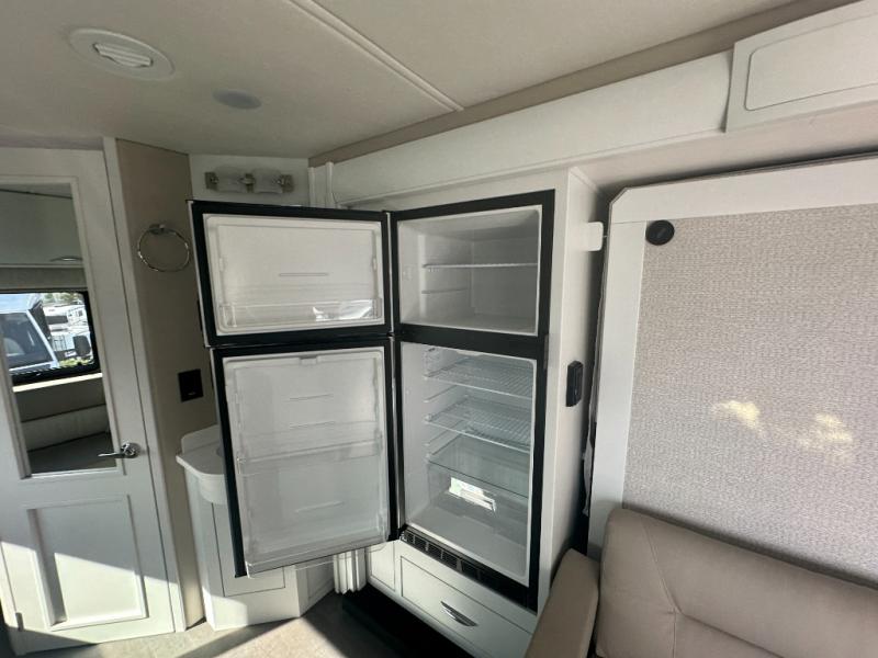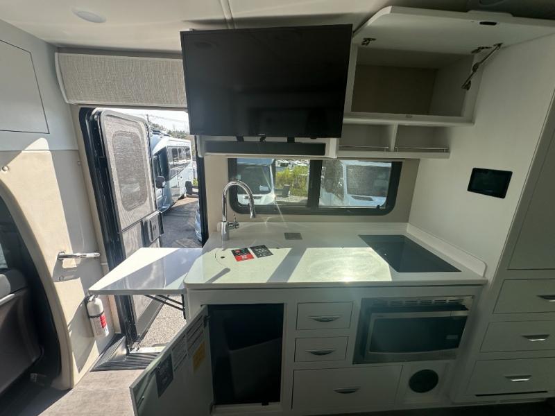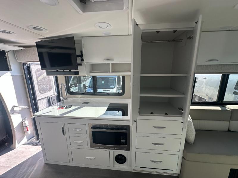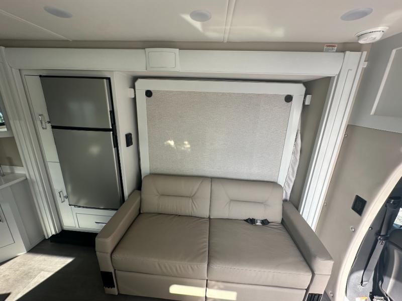 This motorhome offers flexibility and comfort! An L-sofa with storage provides room to relax in the rear corner, or sit on the jiffy sofa towards the front. At night you will enjoy sleeping on the 65" x 72" Murphy bed. The rear corner bath includes a sink outside the door for flexible use. The kitchen features an 8 cu. ft. refrigerator, microwave, and pantry, plus a closet to store miscellaneous items. Step outside and enjoy the exterior entertainment center with a 27" TV, soundbar with Bluetooth streaming, and USB charging!