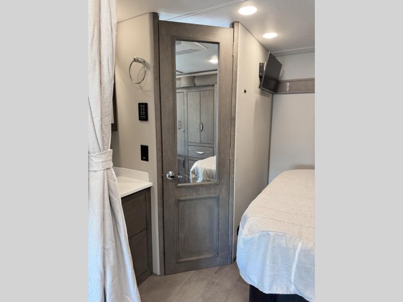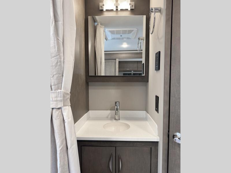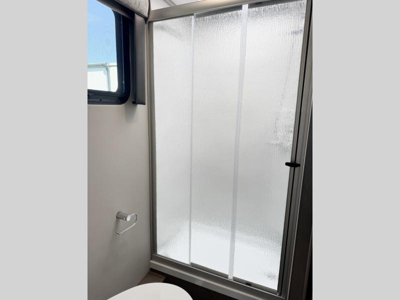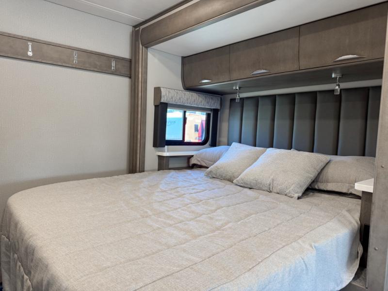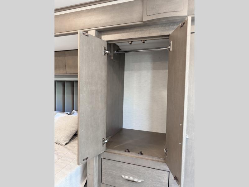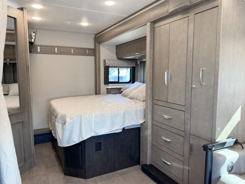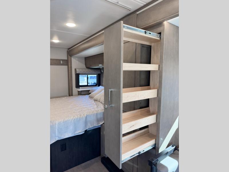 You will have a luxurious experience traveling in this motorhome! After a long day of traveling, you can either take a hot shower in the rear corner private bath, or lay down on the queen bed within the large slide. The bathroom sink is just outside the door with a medicine cabinet to store your toiletries. There is plenty of storage throughout between the wardrobe, the overhead cabinets, and the pantry, as well as outside with side swing baggage doors. The dinette is a great place to enjoy meals, play games, and transform into a sleeping space, and with a 46" x 80" bunk mattress above the cab, another person can join in on the fun!