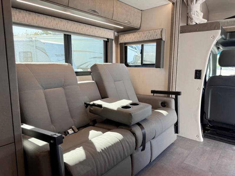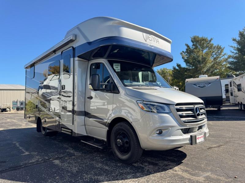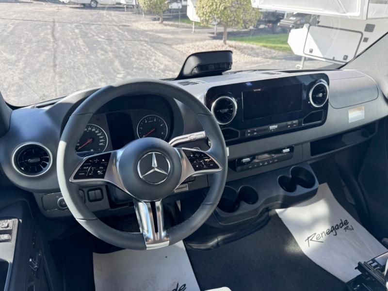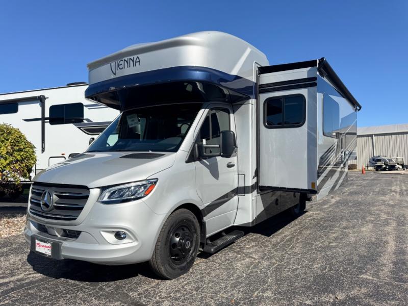 Luxury is in the details of each one of these Renegade Vienna Class C diesel motorhomes! They are built on a Mercedes-Benz Sprinter chassis, and include a four point hydraulic leveling system with app control, a 2000w true sine wave hybrid inverter, a 3.6KW LP generator with auto gen start, and a Winegard Connect rooftop OTA antenna with Wi-Fi and 5G ready. You will appreciate the Truma™ Comfort Plus tankless water heater when showering, the accent lighting at the galley countertop for style, and the USB charging in the living area, bedroom and kitchen to keep your electronics ready. The Maple hardwood cabinetry completes the luxurious décor throughout the inside. Make your selection today!