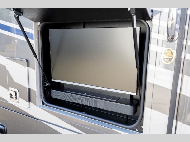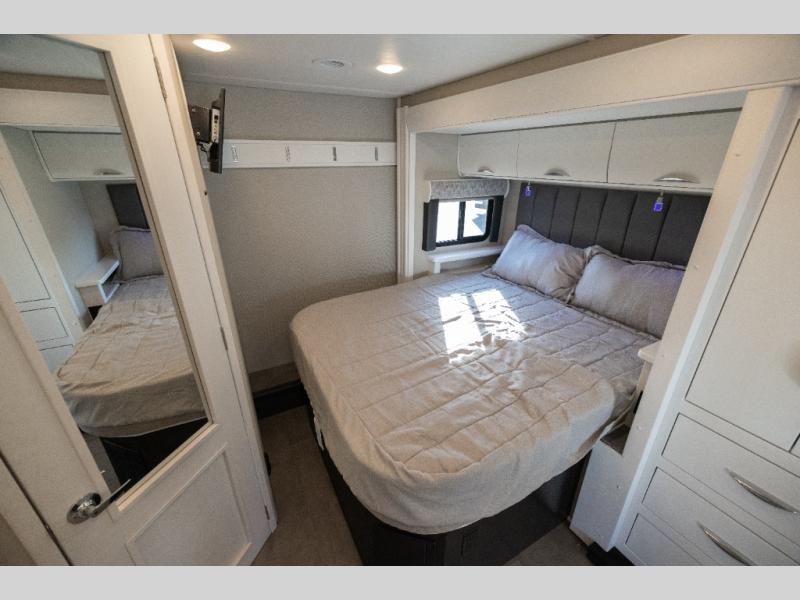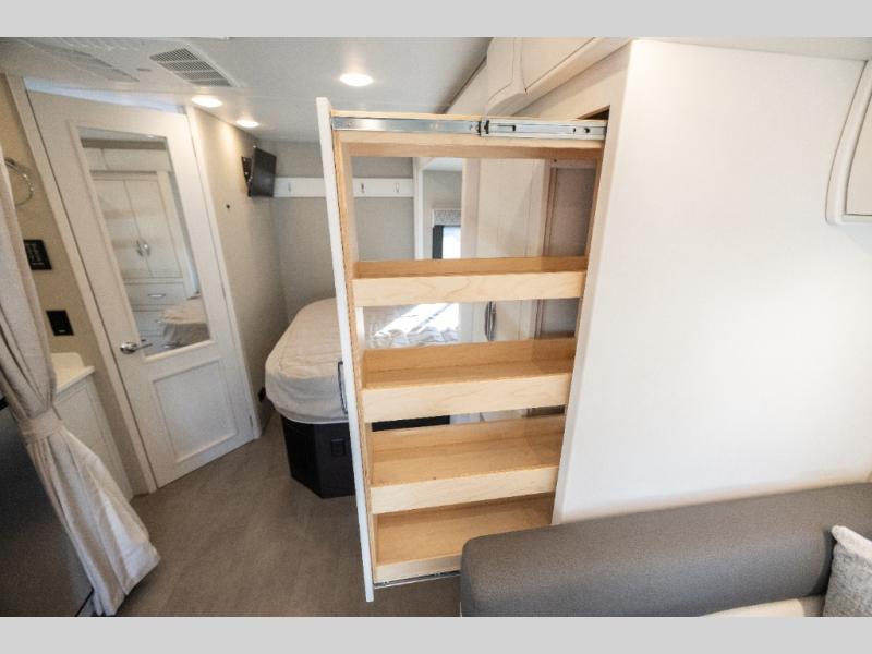 You will have a luxurious experience traveling in this motorhome! After a long day of traveling, you can either take a hot shower in the rear corner private shower and toilet room, or lay down on the RV queen bed within the large slide. The bathroom sink is just outside the door with a medicine cabinet to store your toiletries. There is plenty of storage throughout between the wardrobe, the overhead cabinets, and the pantry, as well as outside with side swing baggage doors. The dinette is a great place to enjoy meals, play games, and transform into a sleeping space. And you might like to add the cab table option so you have a place for your morning coffee while sitting in the front seats.