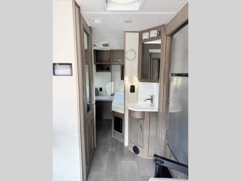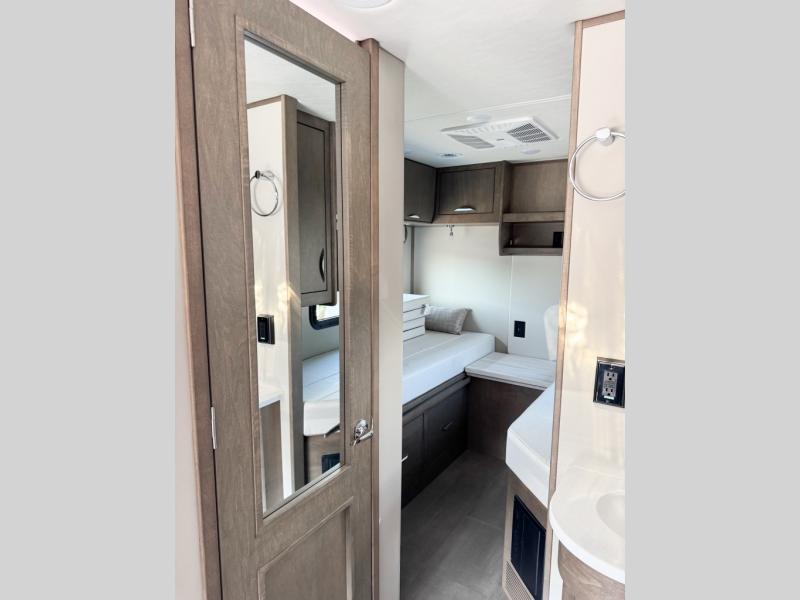 The perfect coach for two along with room for an added guest or little ones with the 46" x 80" over the cab bunk! You will appreciate the storage throughout for your belongings, so no worries about leaving anything behind. The single slide out along the driver's side adds more walking around space inside. Prepare light meals and snacks with ease while you travel with a two-burner cooktop and round sink for cleaning up. There is cupboard storage in the overhead areas for your dishes, and the refrigerator/pantry is located opposite within the sofa slide. The onboard bathroom features a private toilet and shower area with a separate sink just opposite the door. In the rear of the coach, there are two twin mattresses, a 24" TV and overhead storage along each side and rear of the coach, plus more storage can be found at the foot of each bed.