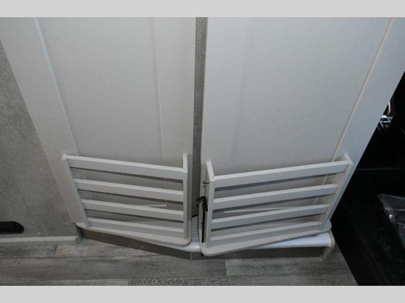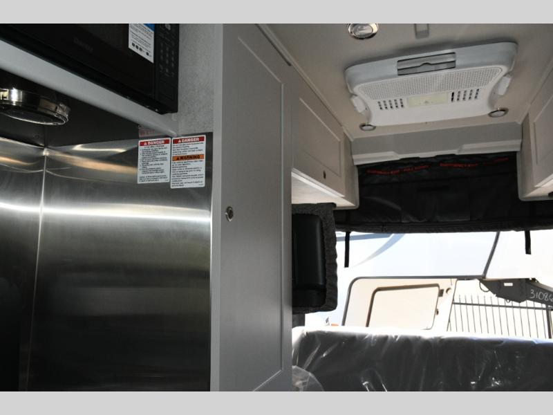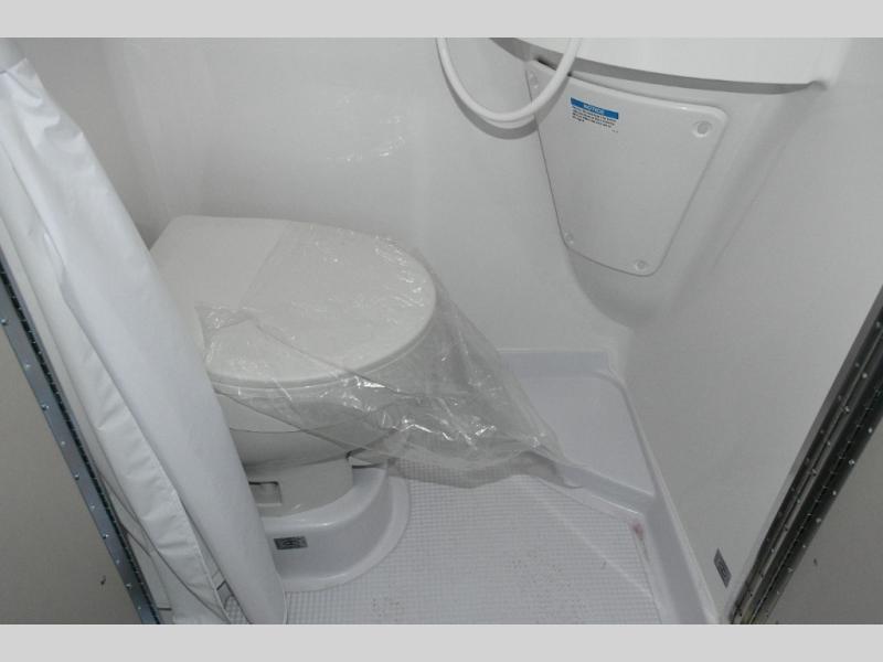 The interior features a bright and open creamy malt décor with an 11,000 BTU air conditioner to keep you comfortable. The kitchen includes a 5.3-cu. ft. refrigerator, a two-burner recessed propane stove, microwave, and a slide-out pantry for dry food storage. The coach is pre-wired for a TV to create an entertainment-ready living space.