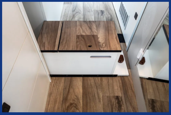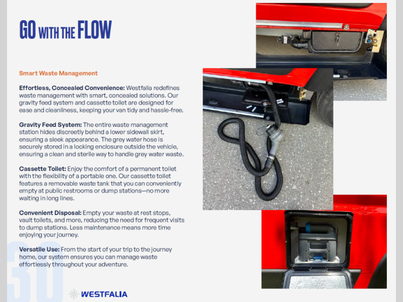 The Roadtrek Westfalia Wave FOR 2 is ready for any adventure! With room to sleep up to 2 people, you are all set for camping fun. Tons of storage space includes 15 different cabinets and drawers, with room for larger items like a bike or paddleboard. The kitchen has everything you might need, including a microwave, LP Gas 2-burner cooktop (or Optional Induction Stove), and large 5.3 cubic foot refrigerator. The wet bath with sink, shower, and cassette toilet means you won't have to rely on campground facilities - you are truly independent in this one! The rear sleeping area can be lifted up for large walk through storage. Dine at the flip down table under an oversized 17" x 25" skylight provides the perfect view.