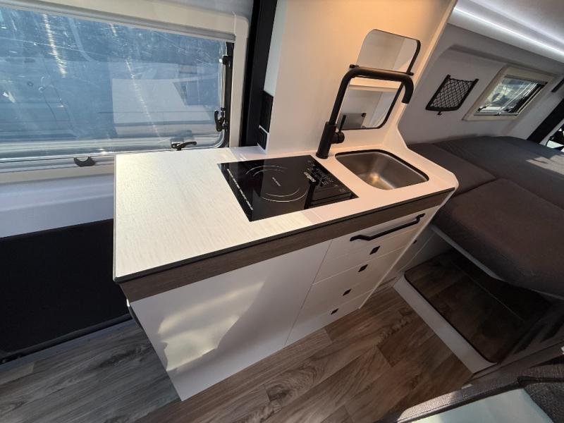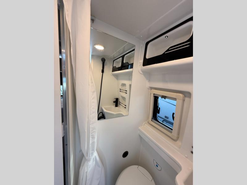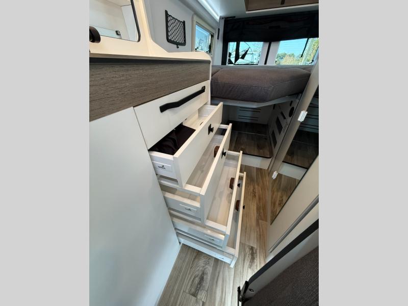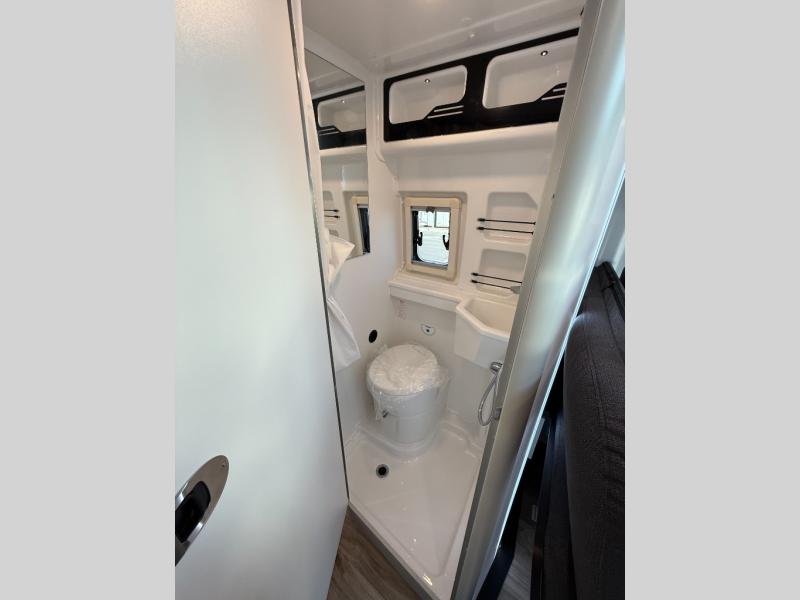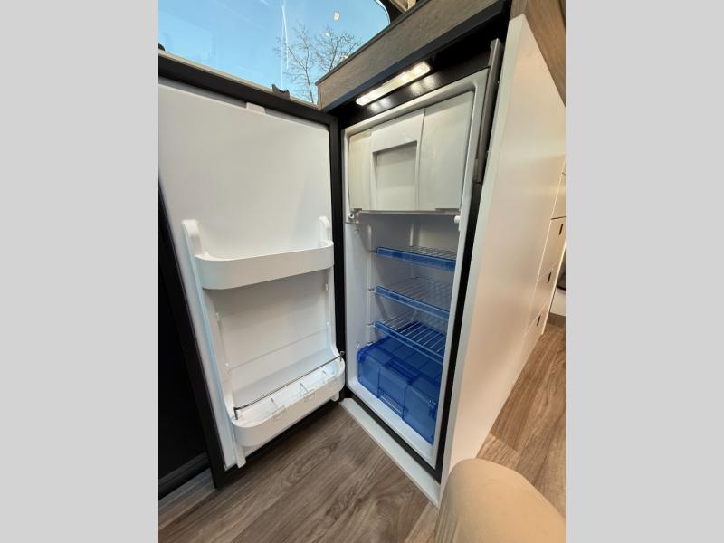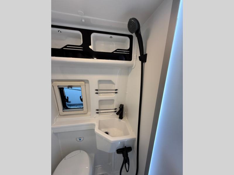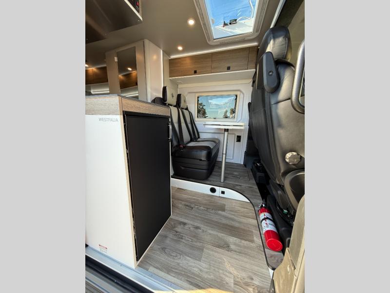 The Roadtrek Westfalia Wave Skylight is ready for any adventure! With room to sleep up to 4 people, you are all set for camping fun. Tons of storage space includes 17 different cabinets and drawers, with room for larger items like a bike or paddleboard. The kitchen has everything you might need, including a microwave, the optioned 1 burner cooktop, and 3.2 cubic foot 12v refrigerator. The wet bath with sink, shower, and cassette toilet means you won't have to rely on campground facilities - you are truly independent in this one! The rear sleeping area can be configured with a king or queen size mattress, while the front combination bench/bed provides additional sleeping area. Dine at the adjustable swivel table with its bench/bed which can be converted for additional sleep space. An oversized 17" x 25" lift-up skylight provides the perfect view and fresh air.