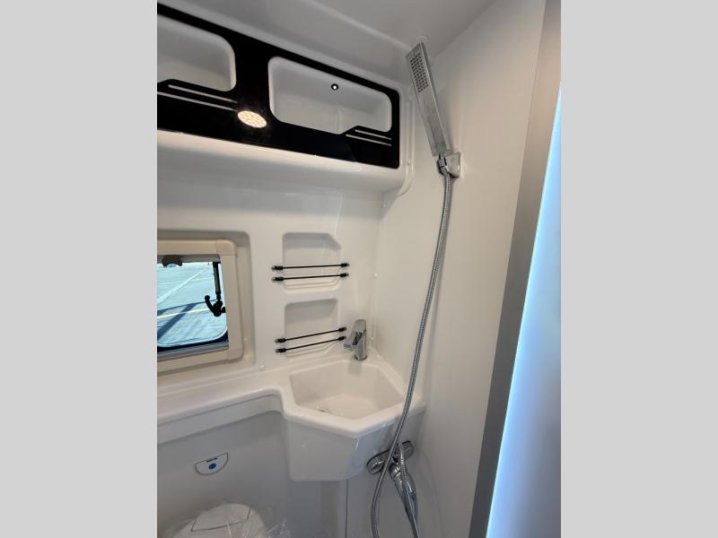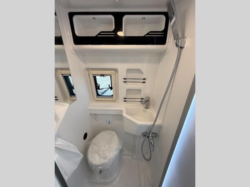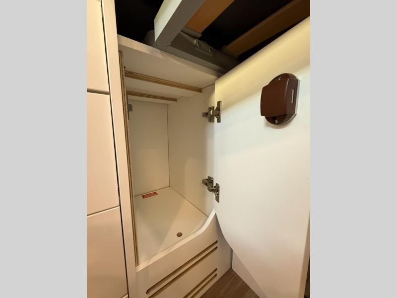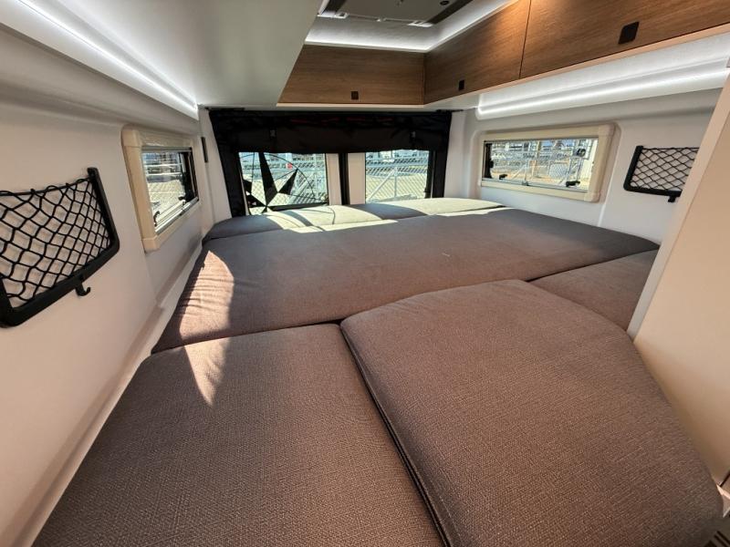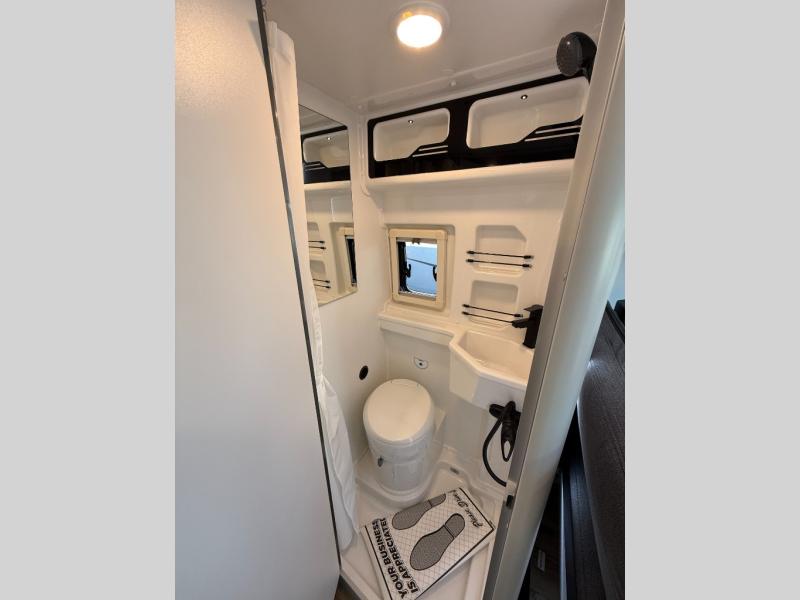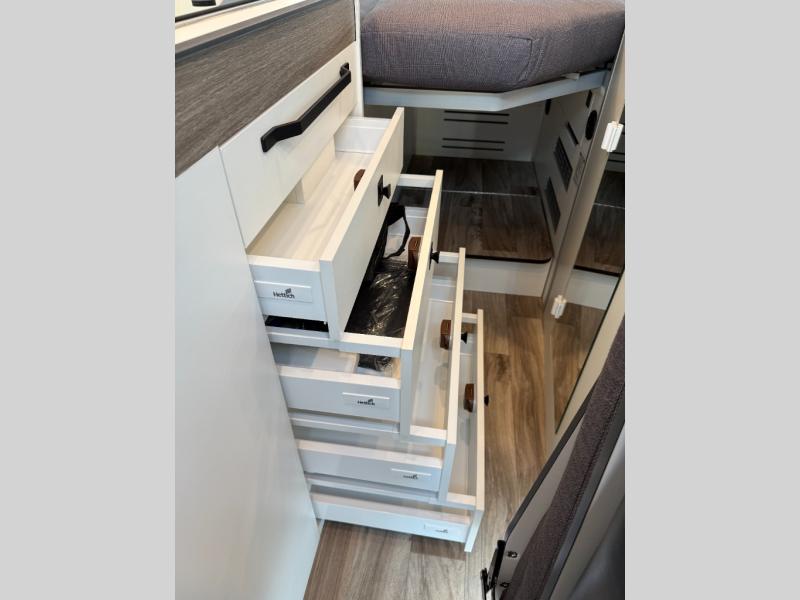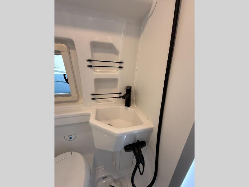 The Roadtrek Westfalia Wave Skylight is ready for any adventure! With room to sleep up to 4 people, you are all set for camping fun. Tons of storage space includes 17 different cabinets and drawers, with room for larger items like a bike or paddleboard. The kitchen has everything you might need, including a microwave, the optioned 1 burner cooktop, and 3.2 cubic foot 12v refrigerator. The wet bath with sink, shower, and cassette toilet means you won't have to rely on campground facilities - you are truly independent in this one! The rear sleeping area can be configured with a king or queen size mattress, while the front combination bench/bed provides additional sleeping area. Dine at the adjustable swivel table with its bench/bed which can be converted for additional sleep space. An oversized 17" x 25" lift-up skylight provides the perfect view and fresh air.