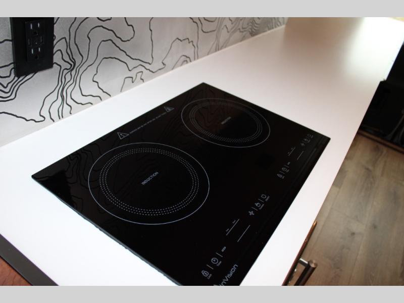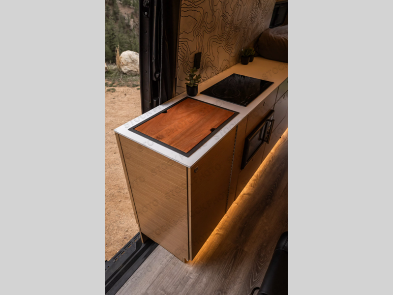 This van is the perfect choice for you and your partner! The queen-size murphy bed offers ample headspace above, ensuring a restful night's sleep. Hydronic in-floor heating provides cozy warmth, while the 12-foot countertop offers ample space for meal prep. The 5" thick adjustable mattress ensures comfort, and an optional pop-top tent provides additional living space. The bathroom features a heater vent and cassette toilet for convenience, and swivel seating for up to 4 people creates extra seating space for guests. The super convenient kitchen has a microwave/air fryer/oven and a 150L black double-door fridge/freezer, providing culinary flexibility. Plus, a two-burner induction cooktop makes meal prep effortless, and an outdoor rear shower offers a refreshing rinse after a day of exploring.