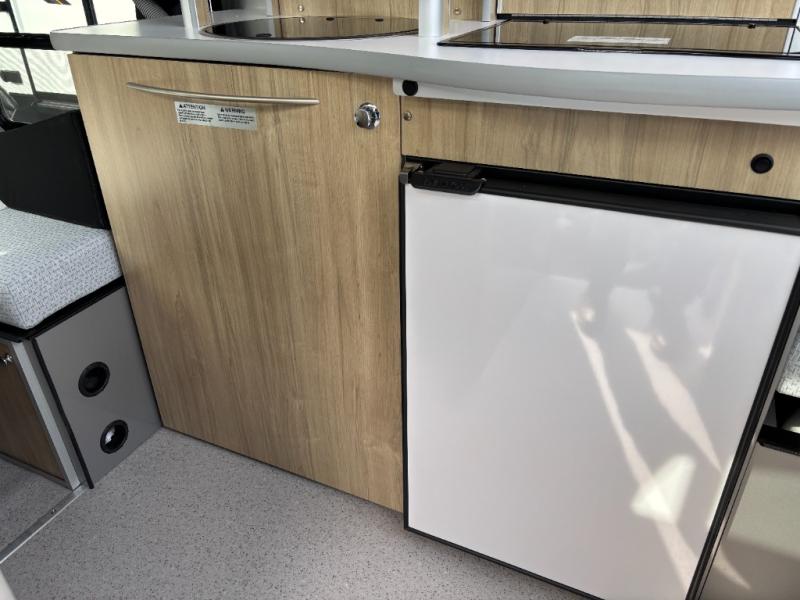 Wherever you decide to camp, you'll enjoy at-home comforts in this compact travel trailer. There is a large 60" x 76" bed-size to sleep on each night, and the dining area converts to a 36" x 81' single bed for guests. A shower with a curtain and a flush toilet will let you freshen up each day, an the front dining area can be used when when the rear bed is deployed. You also have the ability to set up two separate dining areas by moving the table if you choose. A two burner LPG stove will let you cook meals each day, and perishables can go in the 3.1 cu. ft. refrigerator.