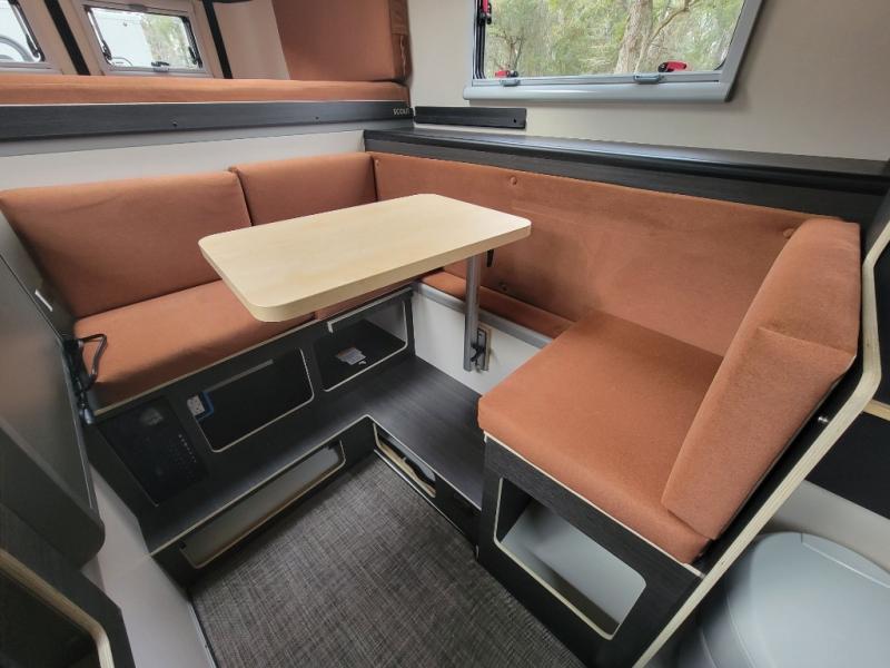 This attractive and accommodating truck camper is equipped with your very own designated bathroom area which has a Lifesaver portable 4.9 gal. Jerry can with charcoal filter and spray wand! Enjoy a good night's rest each night on the front bed and convertible dinette lounge with sleeper conversion. Gaze up at the stars through the moon roof with screen and solar reflective shade. The porch light will come in handy at night and the snap-in privacy curtain adds extra privacy when needed. Don't worry about tracking dirt inside thanks to the mud room entrance with a stainless steel drain pan!