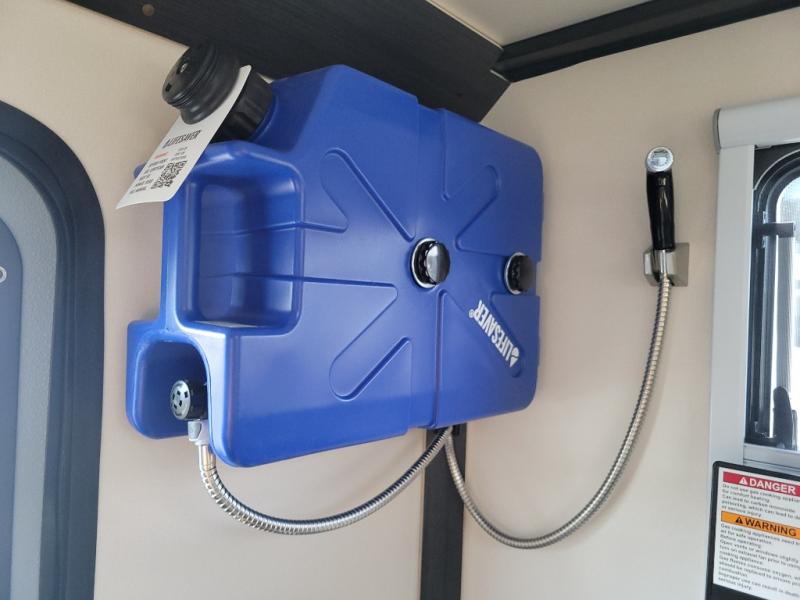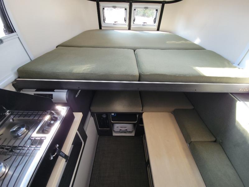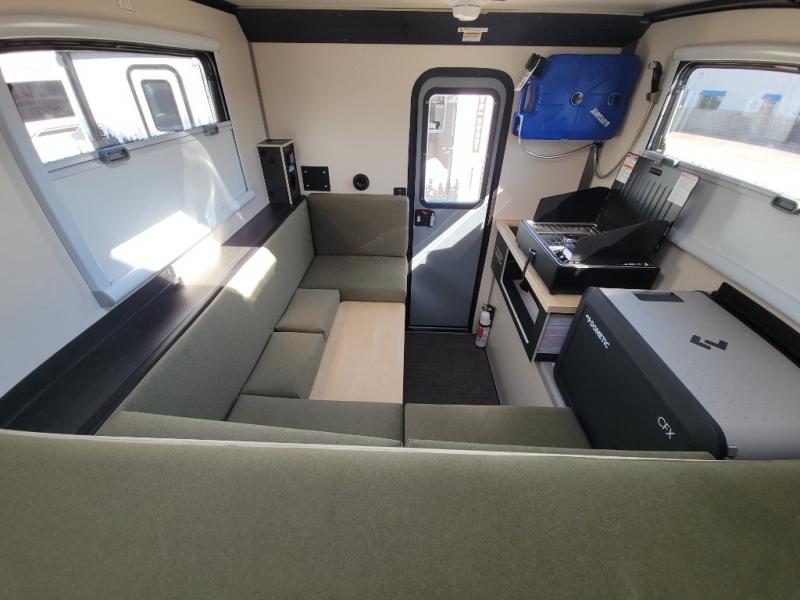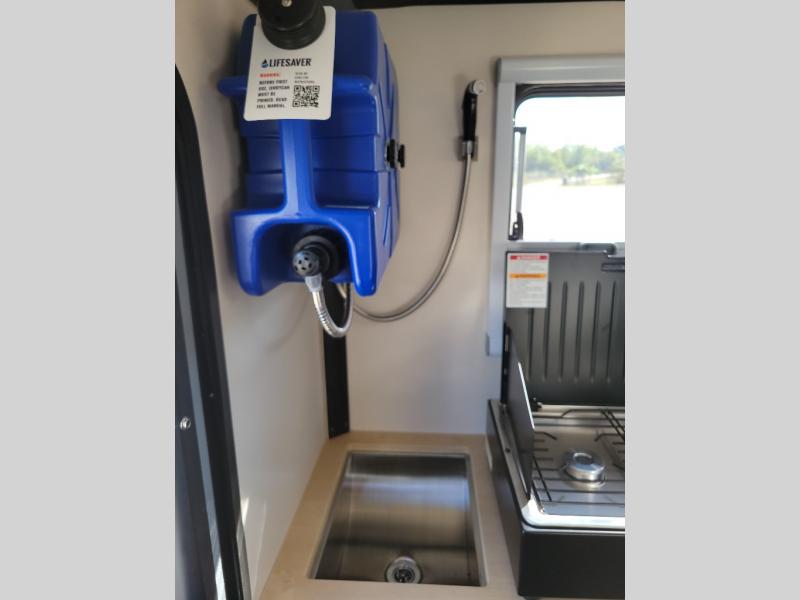 Access more terrain in this truck camper with its small size and exceptionally low base weight! Pack more gear into the 4 cu. ft. gear locker and worry less about payload capacities. The removable camper jacks help you to manage your travel weight too. Relax each night on the front bed and convertible dinette lounge with sleeper conversion as you gaze up at the stars through the moon roof with a screen and solar reflective shade. Stay clean with the Lifesaver portable 4.9 gal Jerry can with charcoal filter and spray wand, and keep your dishes clean with the stainless sink with direct exterior drain and sink cover!
