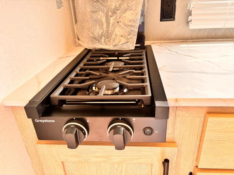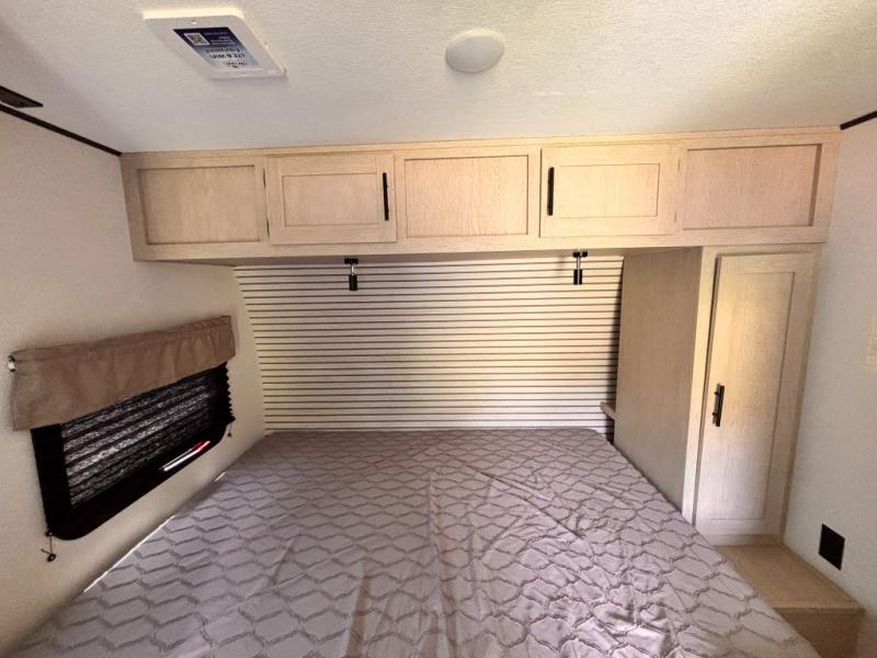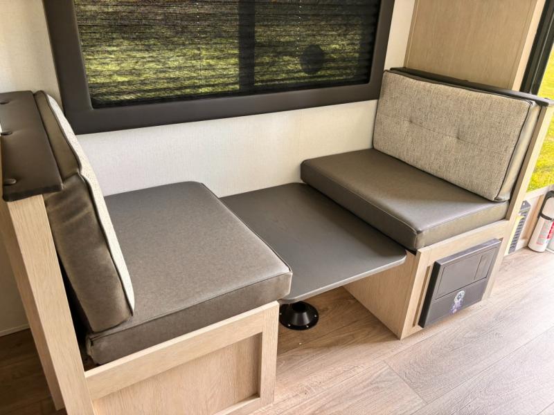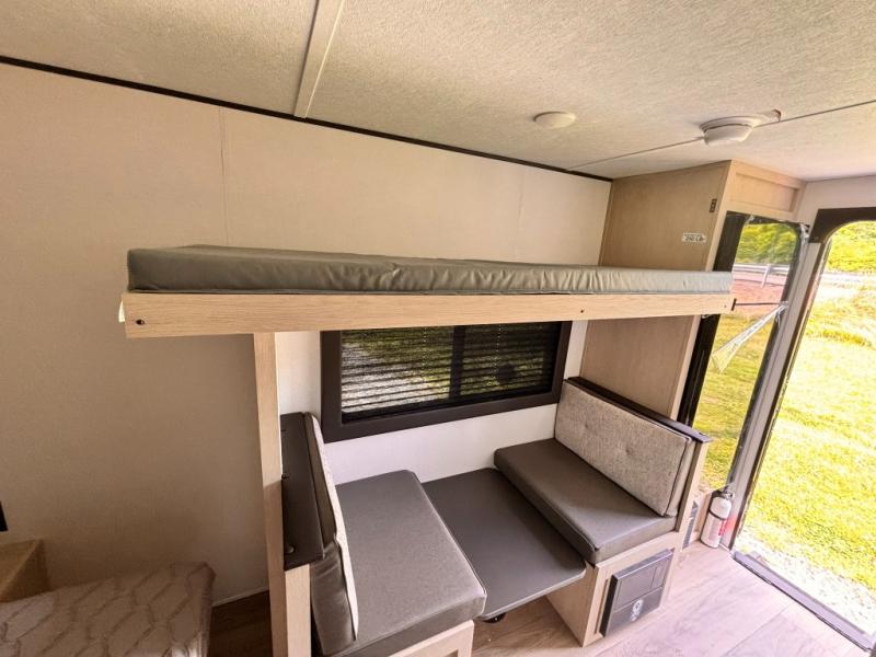 You will love exploring different campgrounds in this rear entry travel trailer! Since there is a front queen bed, a booth dinette, plus a flip-up bunk above the dinette, you can sleep four people comfortably. The private bathroom includes a toilet and a shower to freshen up in each day, and you can use the kitchen sink to brush your teeth at night. This model also includes an exterior pass-through storage for larger camp gear and an outside shower to wash your hiking gear off!