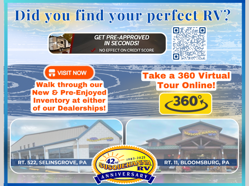 We are a premier dealer for all camping needs. If you are traveling from anywhere in Pennsylvania we have you covered. We service York, Harrisburg, Lancaster, Reading, Lewisburg, Williamsport, Philadelphia, Pittsburgh, State College, Lewistown, Bloomsburg, Allentown, Scranton, Wilkes-Barre, Lebanon, Manheim, Duncannon, Shamokin Dam, Elysburg, Danville, Sunbury, Berwick, Mt. Carmel, Hershey, Pottsville, Frackville, Centralia, Wiles -Barre, Scranton, Long Pond, and more. In New Jersey, Delaware, West Virginia, New York, or the Maryland regions; we are the RV dealer to see. Please browse our huge RV inventory today at WWW.SUSQRV.COM.
