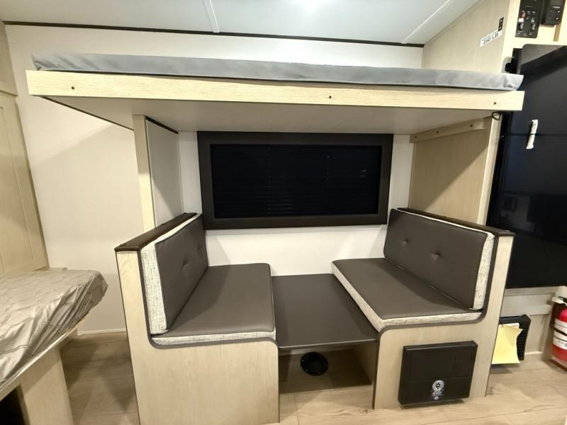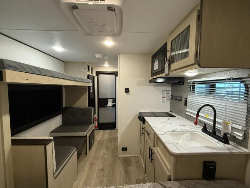 You will love exploring different campgrounds in this rear entry travel trailer! Since there is a front queen bed, a booth dinette, plus a flip-up bunk above the dinette, you can sleep four people comfortably. The private bathroom includes a toilet and a shower to freshen up in each day, and you can use the kitchen sink to brush your teeth at night. This model also includes an exterior pass-through storage for larger camp gear and an outside shower to wash your hiking gear off!