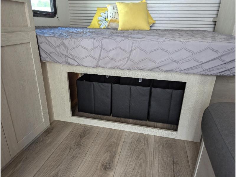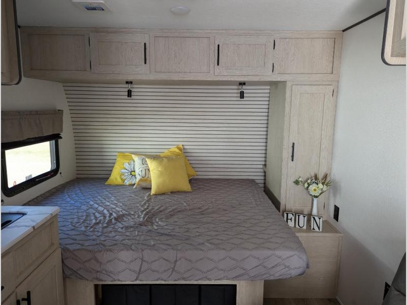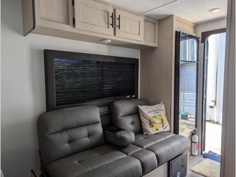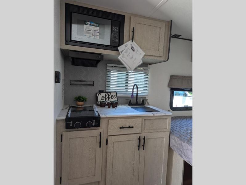 This trailer is perfect for couples or weekend trips to the lake with your buddy. There is a front queen bed with an overhead cabinet, a wardrobe, plus a bed shelf to keep valuables close by, and the sofa will provide seating and sleeping space for guests. There is a private bathroom with a toilet and a shower so you won't have to use the camp's facilities in the middle of the night. You will love having a two burner cooktop and microwave oven to cook meals each day, plus there is a 4.5 cu. ft. refrigerator for cold items!