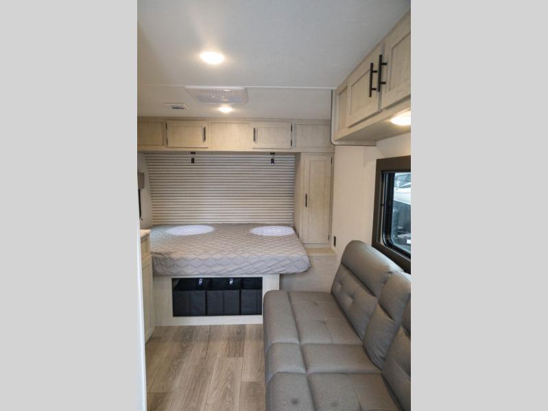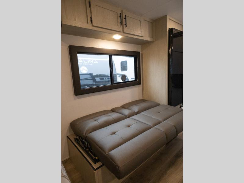 This trailer is perfect for couples or weekend trips to the lake with your buddy. There is a front queen bed with an overhead cabinet, a wardrobe, plus a bed shelf to keep valuables close by, and the sofa will provide seating and sleeping space for guests. There is a private bathroom with a toilet and a shower so you won't have to use the camp's facilities in the middle of the night. You will love having a two burner cooktop and microwave oven to cook meals each day, plus there is a 4.5 cu. ft. refrigerator for cold items!
