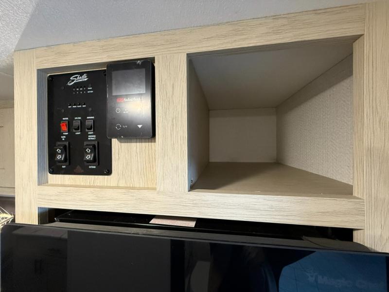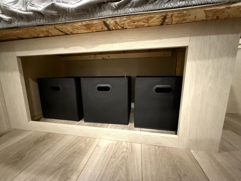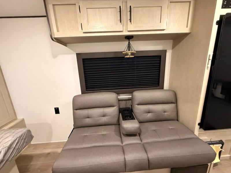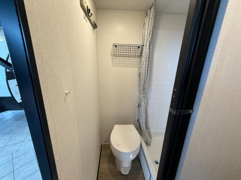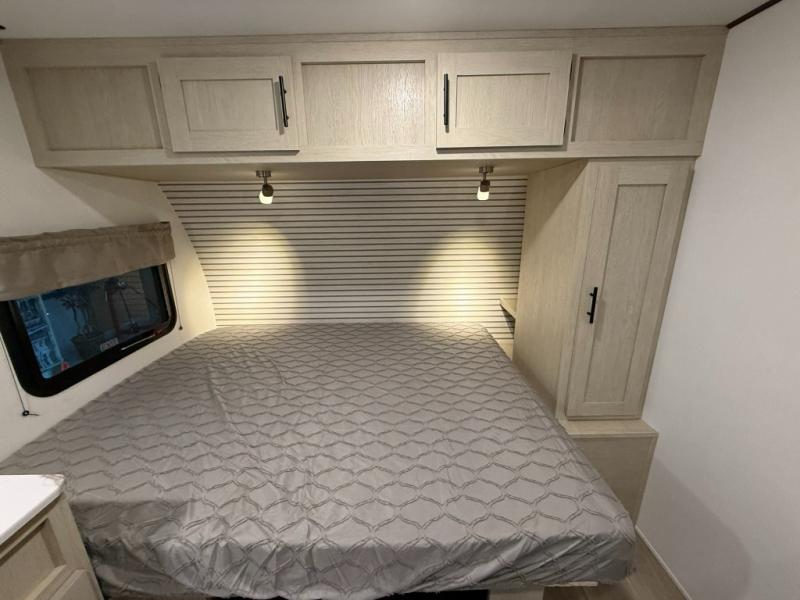 This trailer is perfect for couples or weekend trips to the lake with your buddy. There is a front queen bed with an overhead cabinet, a wardrobe, plus a bed shelf to keep valuables close by, and the sofa will provide seating and sleeping space for guests. There is a private bathroom with a toilet and a shower so you won't have to use the camp's facilities in the middle of the night. You will love having a two burner cooktop and microwave oven to cook meals each day, plus there is a 4.5 cu. ft. refrigerator for cold items!