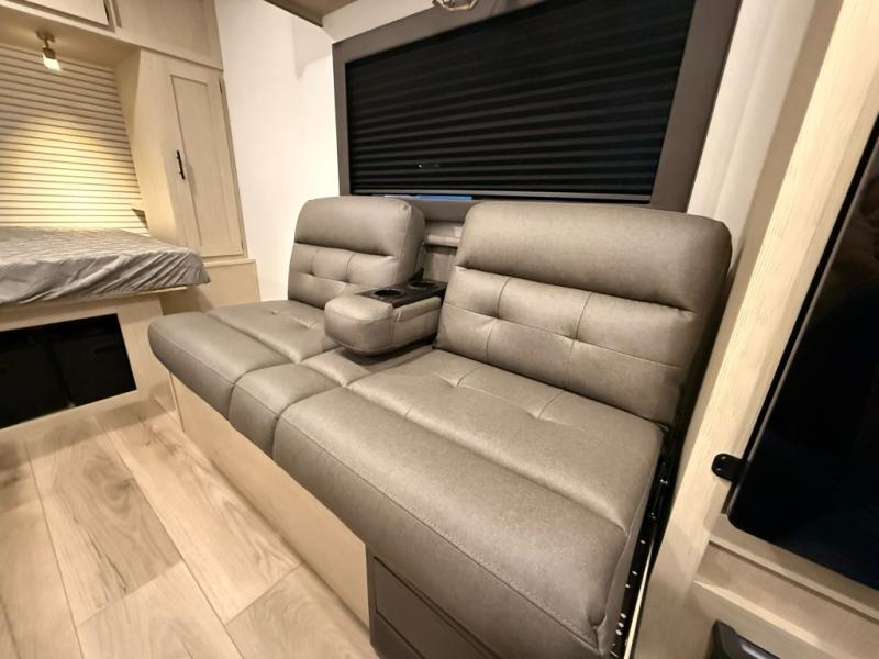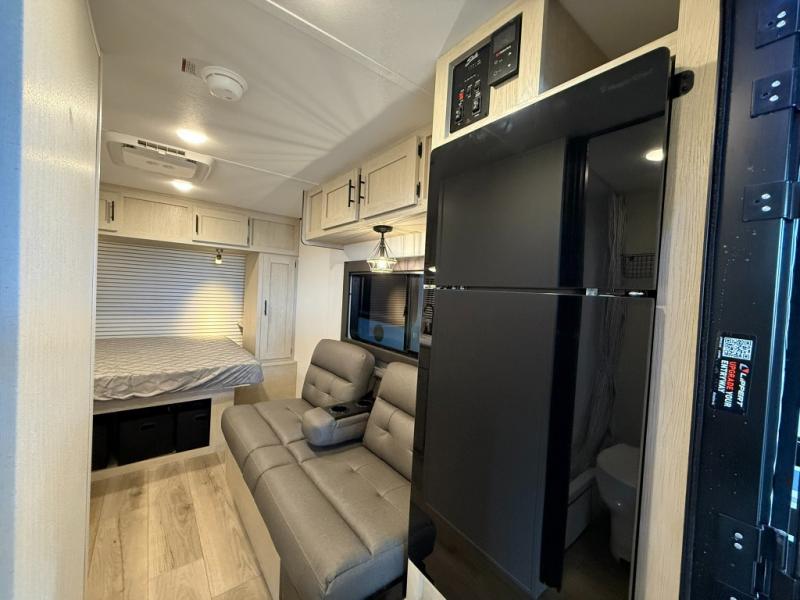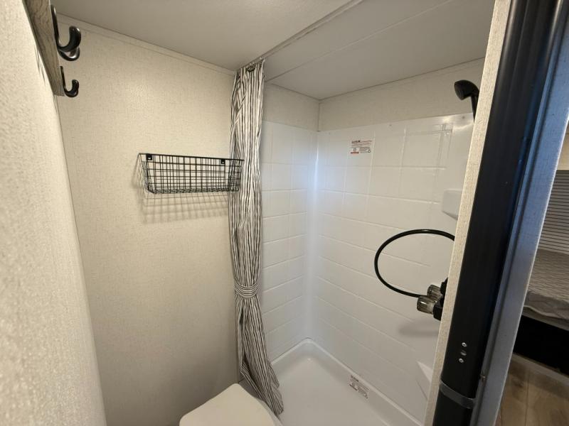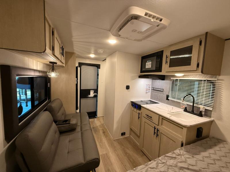 This trailer is perfect for couples or weekend trips to the lake with your buddy. There is a front queen bed with an overhead cabinet, a wardrobe, plus a bed shelf to keep valuables close by, and the sofa will provide seating and sleeping space for guests. There is a private bathroom with a toilet and a shower so you won't have to use the camp's facilities in the middle of the night. You will love having a two burner cooktop and microwave oven to cook meals each day, plus there is a 4.5 cu. ft. refrigerator for cold items!