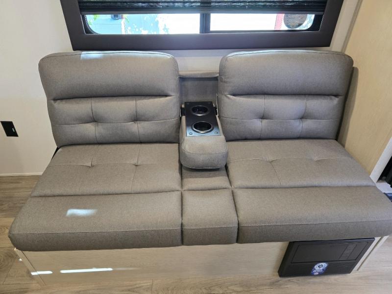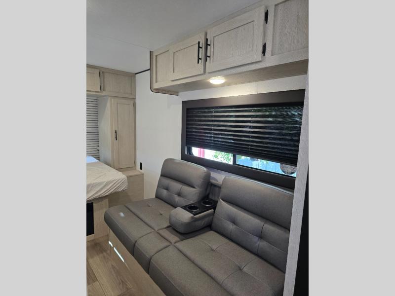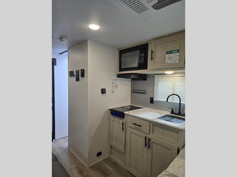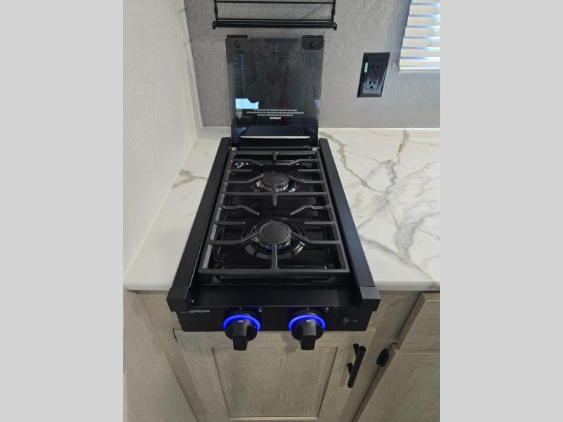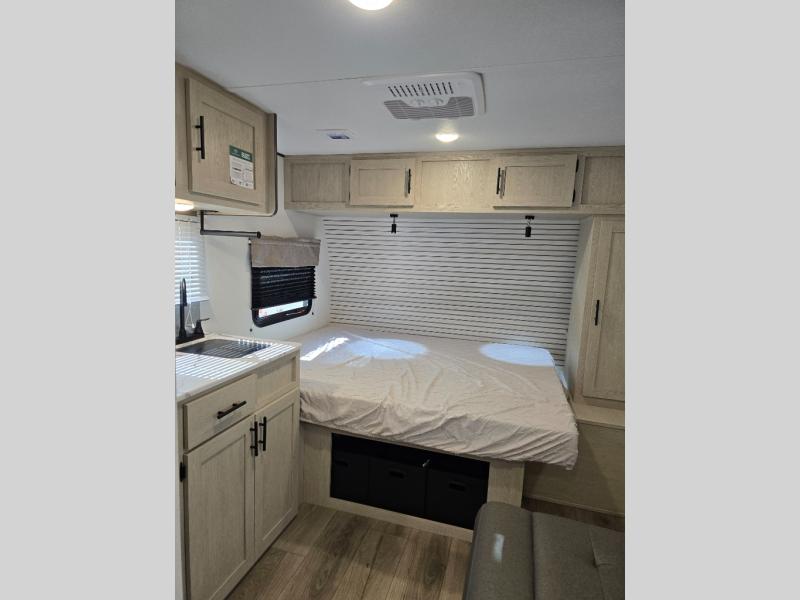 This trailer is perfect for couples or weekend trips to the lake with your buddy. There is a front queen bed with an overhead cabinet, a wardrobe, plus a bed shelf to keep valuables close by, and the sofa will provide seating and sleeping space for guests. There is a private bathroom with a toilet and a shower so you won't have to use the camp's facilities in the middle of the night. You will love having a two burner cooktop and microwave oven to cook meals each day, plus there is a 4.5 cu. ft. refrigerator for cold items!