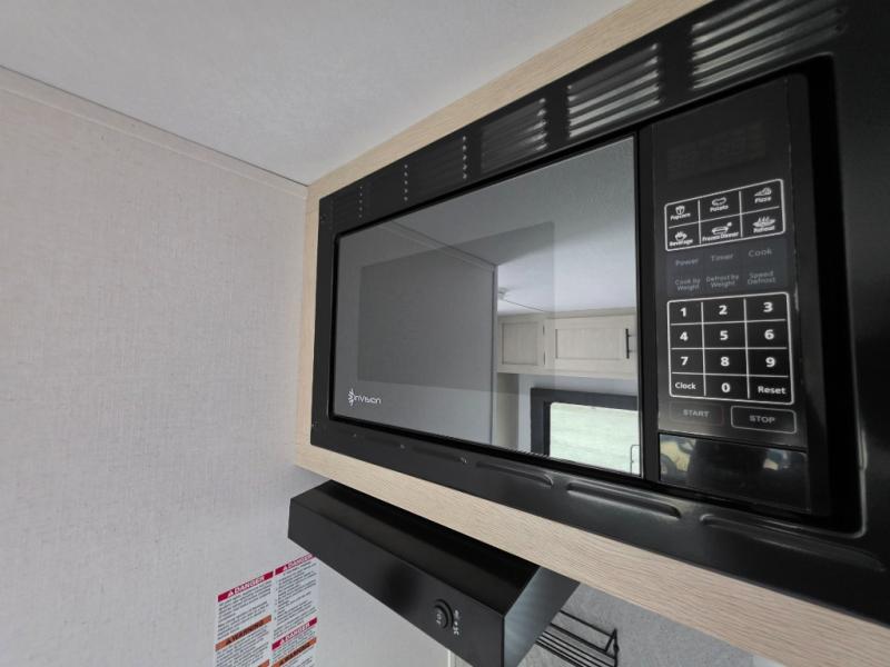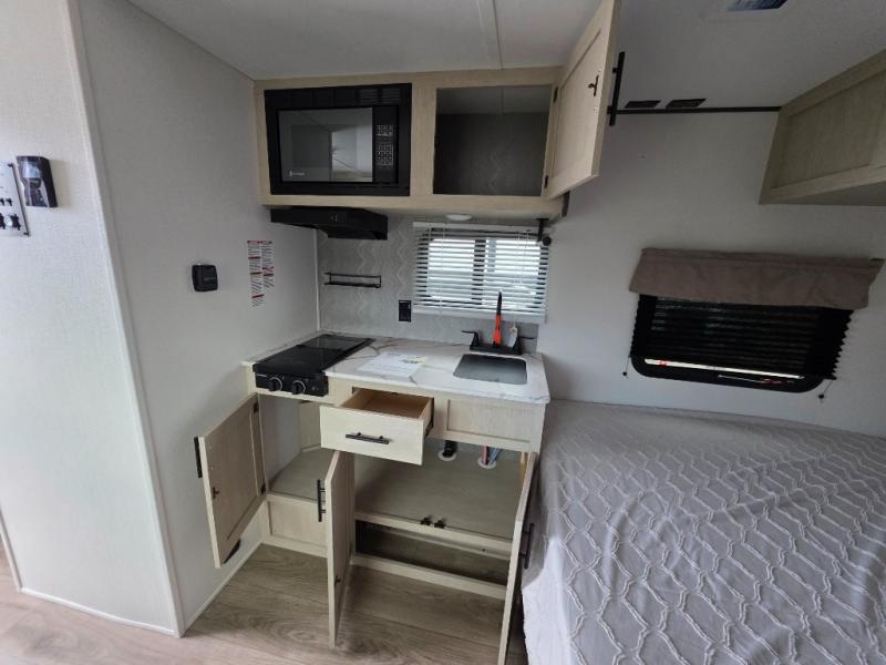 This trailer is perfect for couples or weekend trips to the lake with your buddy. There is a front queen bed with an overhead cabinet, a wardrobe, plus a bed shelf to keep valuables close by, and the sofa will provide seating and sleeping space for guests. There is a private bathroom with a toilet and a shower so you won't have to use the camp's facilities in the middle of the night. You will love having a two burner cooktop and microwave oven to cook meals each day, plus there is a 4.5 cu. ft. refrigerator for cold items!