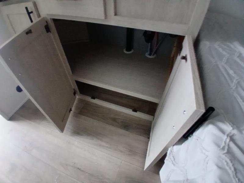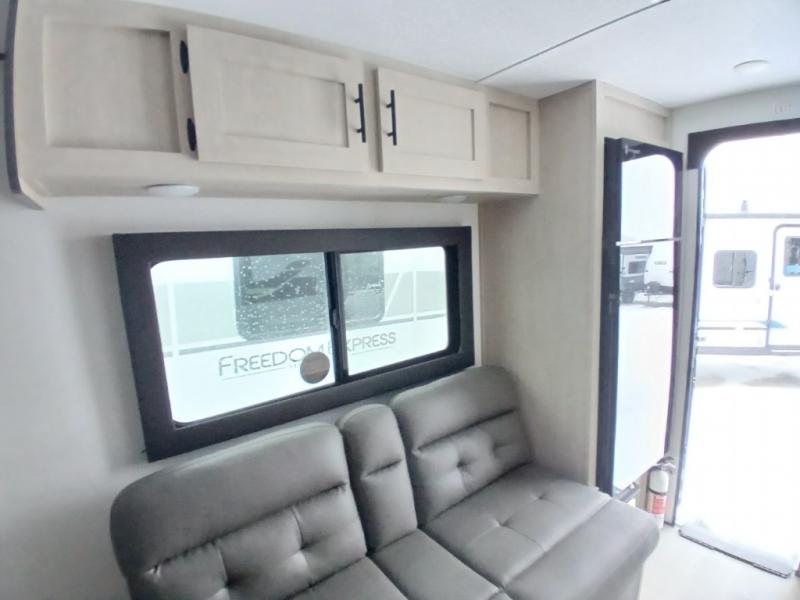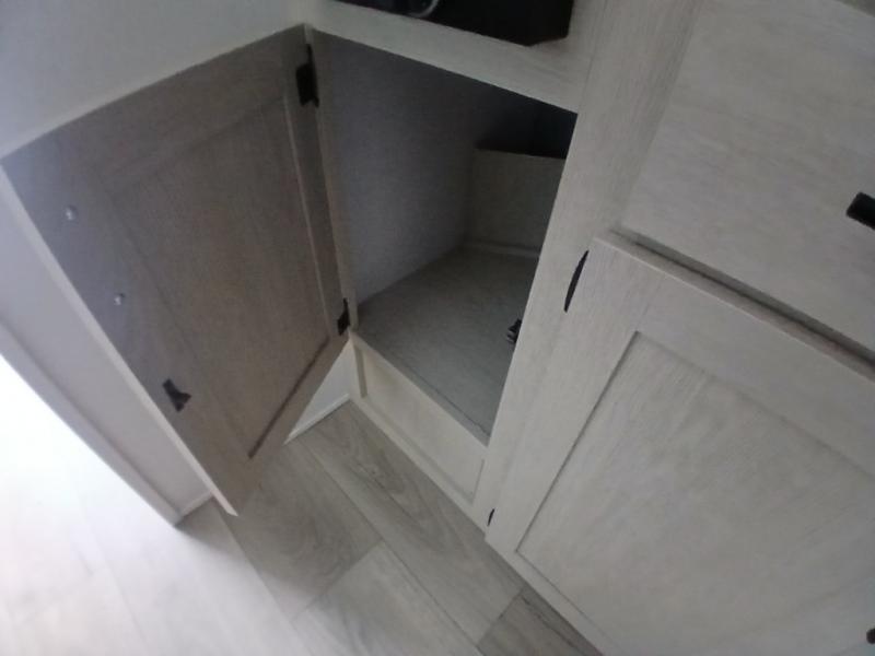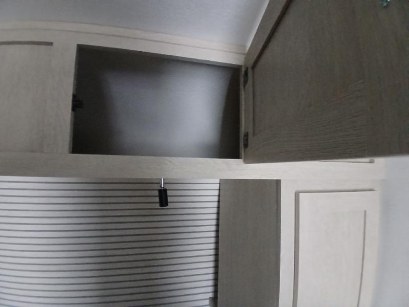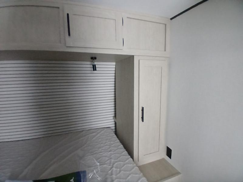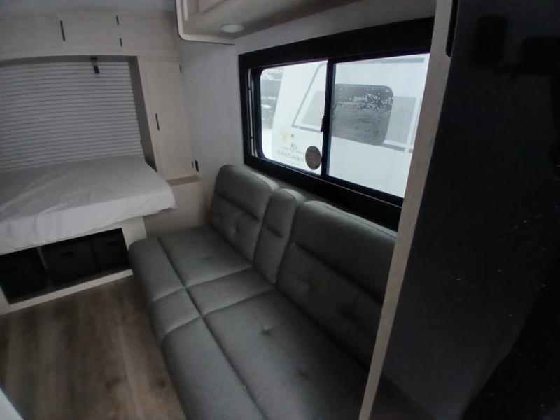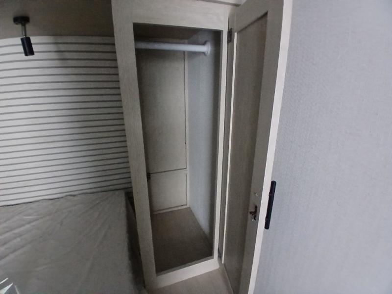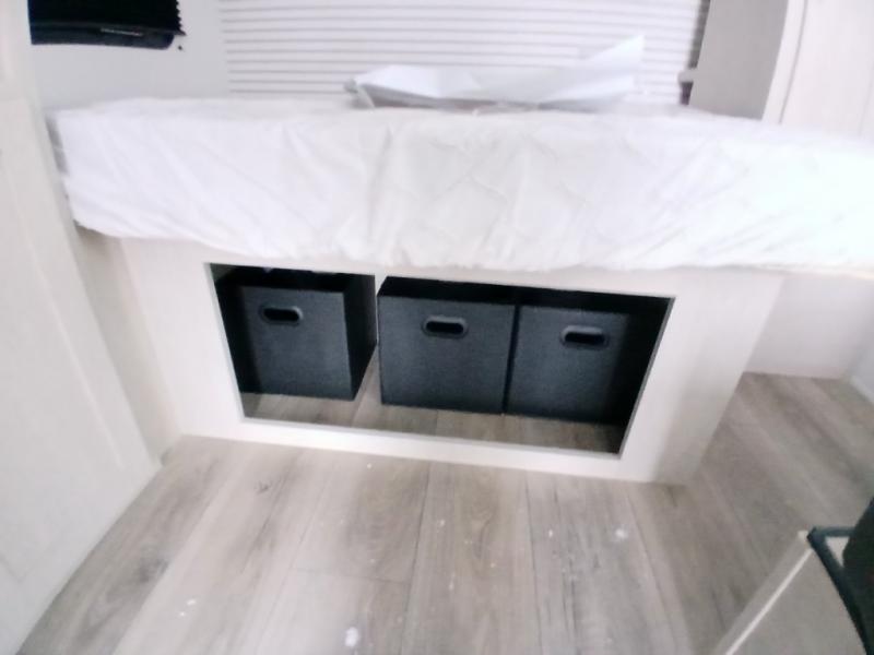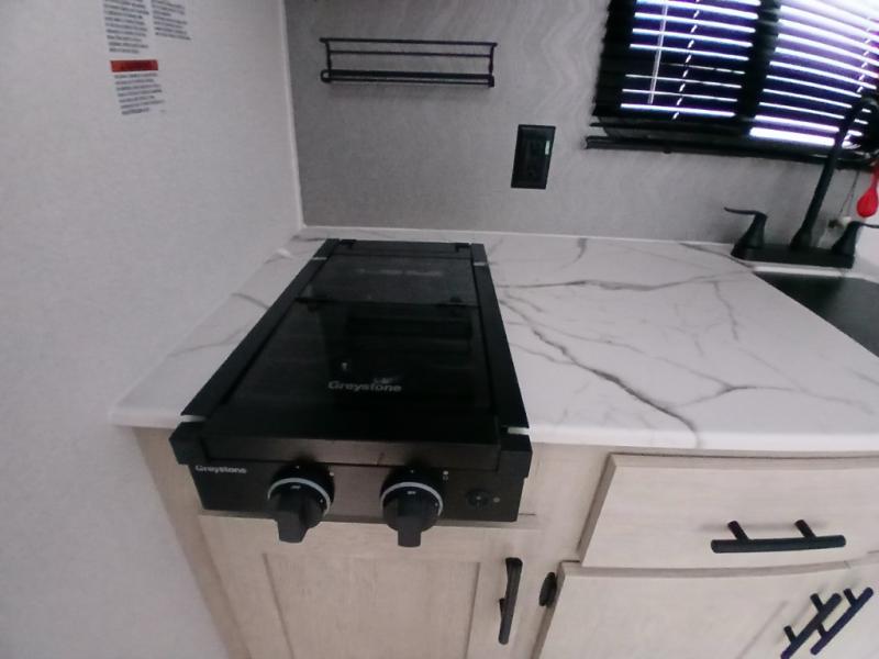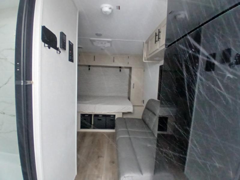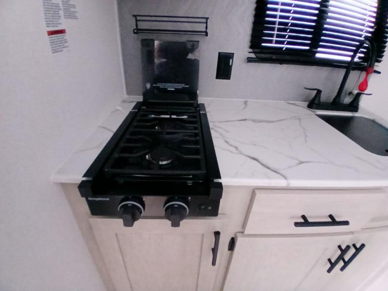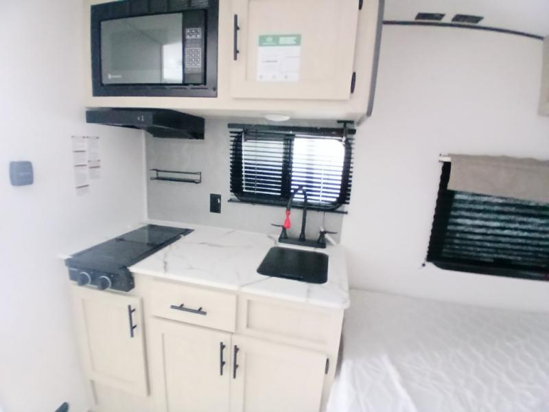 This trailer is perfect for couples or weekend trips to the lake with your buddy. There is a front queen bed with an overhead cabinet, a wardrobe, plus a bed shelf to keep valuables close by, and the sofa will provide seating and sleeping space for guests. There is a private bathroom with a toilet and a shower so you won't have to use the camp's facilities in the middle of the night. You will love having a two burner cooktop and microwave oven to cook meals each day, plus there is a 4.5 cu. ft. refrigerator for cold items!