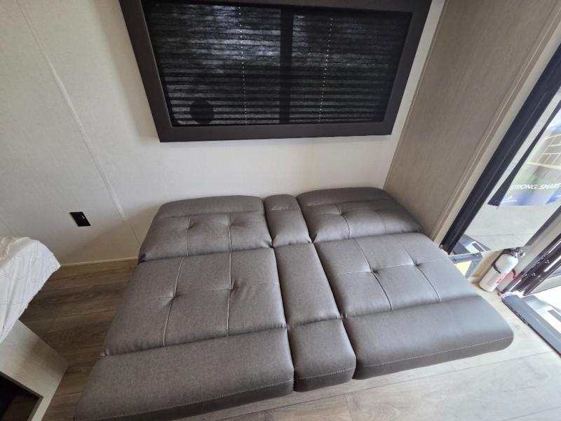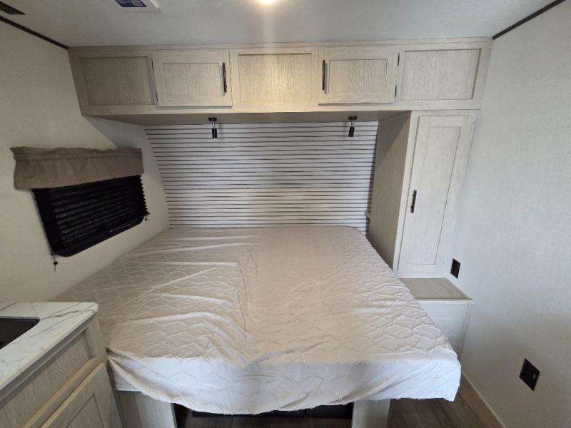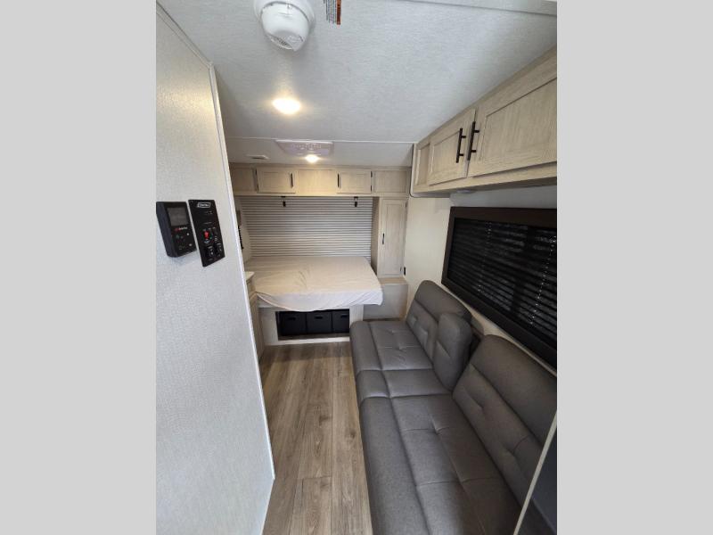 This trailer is perfect for couples or weekend trips to the lake with your buddy. There is a front queen bed with an overhead cabinet, a wardrobe, plus a bed shelf to keep valuables close by, and the sofa will provide seating and sleeping space for guests. There is a private bathroom with a toilet and a shower so you won't have to use the camp's facilities in the middle of the night. You will love having a two burner cooktop and microwave oven to cook meals each day, plus there is a 8 cu. ft. refrigerator for cold items!