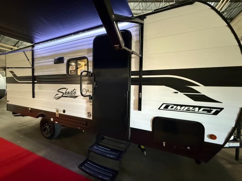 With any Compact travel trailer by Shasta RVs, you will enjoy the camping lifestyle in an easy-to-tow, lightweight unit! Each model includes four stabilizer jacks to keep your travel trailer secure at the campground, and an optional power tongue jack can be added for more convenience. You will appreciate having a tankless water heater for endless hot showers, an 8K BTU A/C to keep you cool, plus solar and back-up camera prep. The interior of each Compact travel trailer includes seamless countertops, kitchen and bath amenities, a Bluetooth portable speaker, plus storage space for all your belongings.