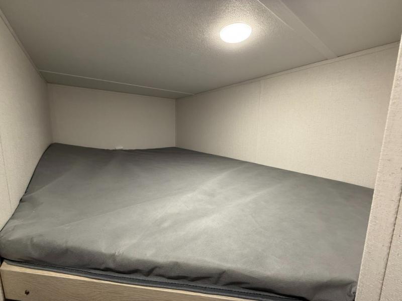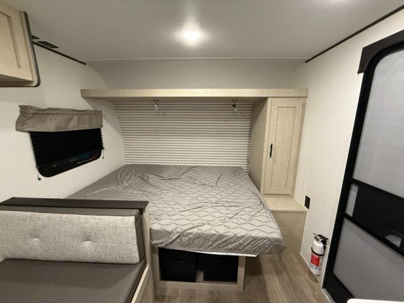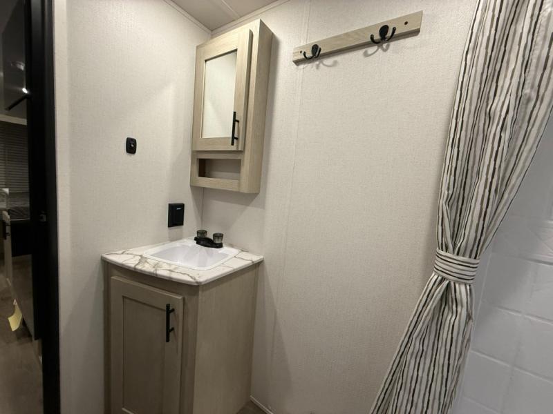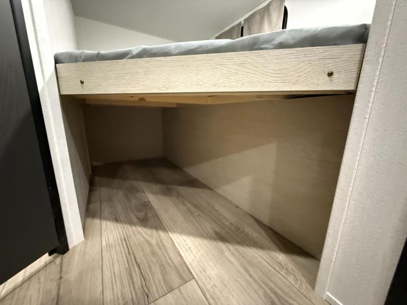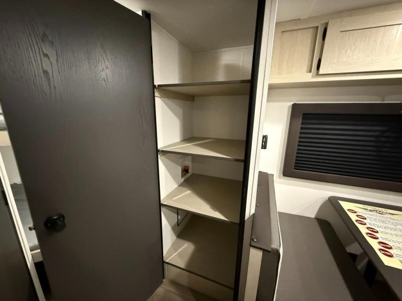 The double-size bunks found in this travel trailer will be perfect for guests, while you take the front RV queen bed! There is a full bath right beside the bunks for easy nighttime use, and the front bed includes a wardrobe at the foot of the bed for your things. Once the chef of your group has made lunch in the kitchen, you can dine at the booth dinette or take your plate outdoors to sit at the campground picnic table. There is also a kitchen pantry that is washer/dryer ready if you plan to add those appliances. This model also includes plenty of storage space, including an exterior pass-through for fishing poles, hiking gear, and more!