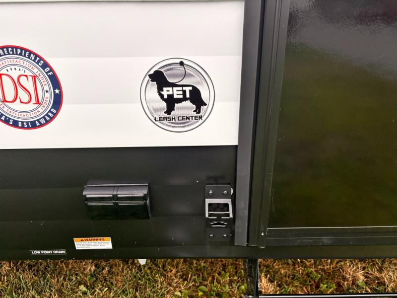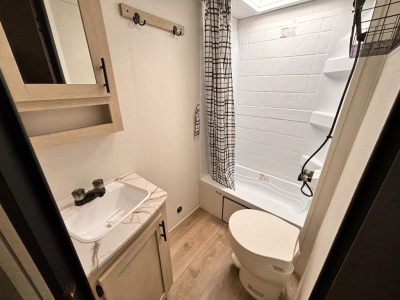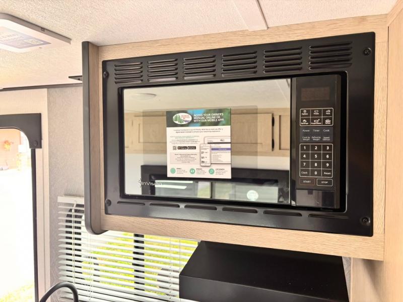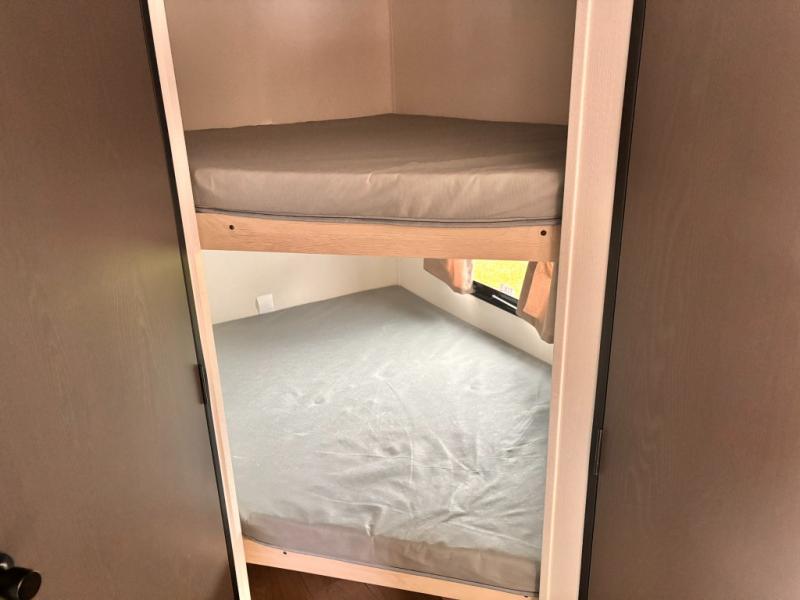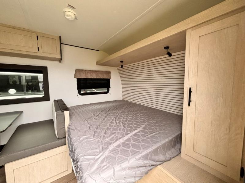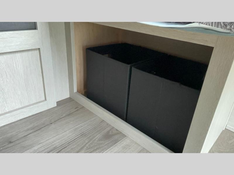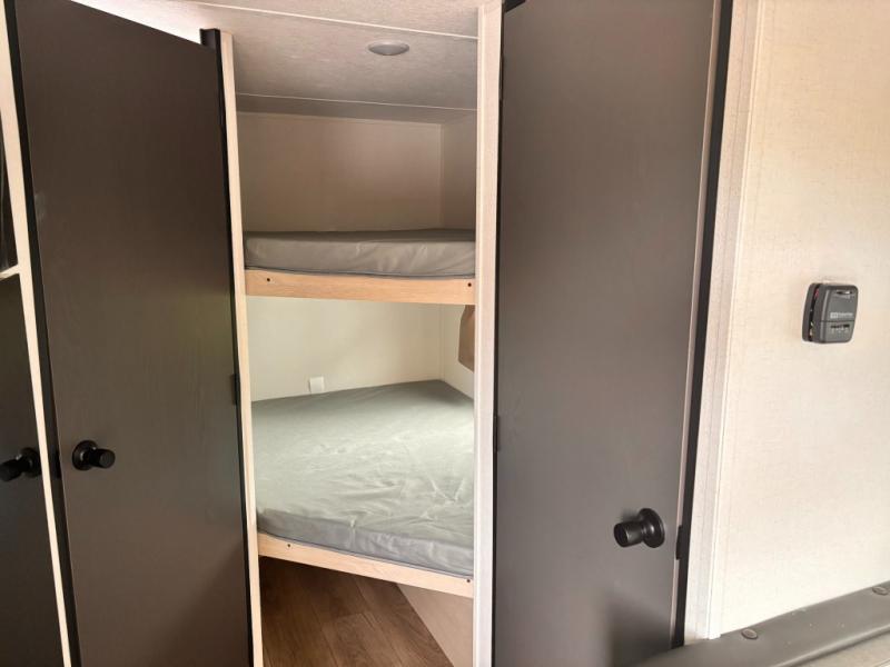 The double-size bunks found in this travel trailer will be perfect for guests, while you take the front RV queen bed! There is a full bath right beside the bunks for easy nighttime use, and the front bed includes a wardrobe at the foot of the bed for your things. Once the chef of your group has made lunch in the kitchen, you can dine at the booth dinette or take your plate outdoors to sit at the campground picnic table. There is also a kitchen pantry that is washer/dryer ready if you plan to add those appliances. This model also includes plenty of storage space, including an exterior pass-through for fishing poles, hiking gear, and more!