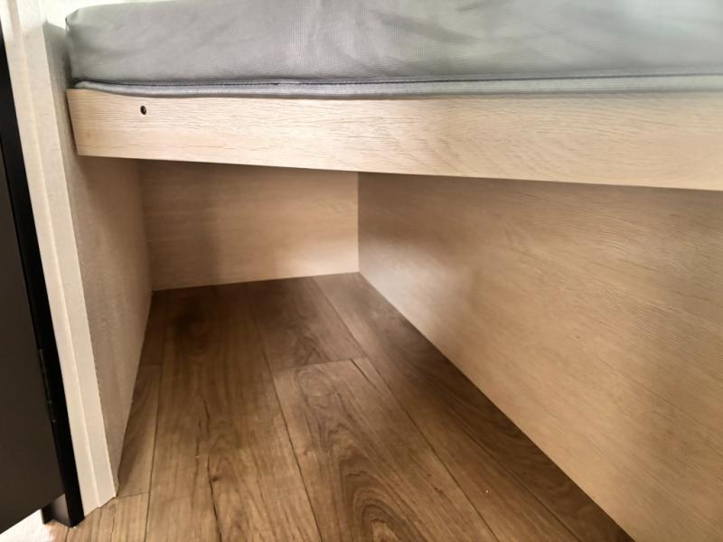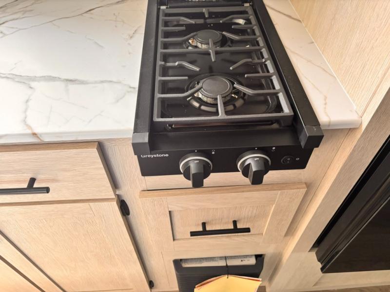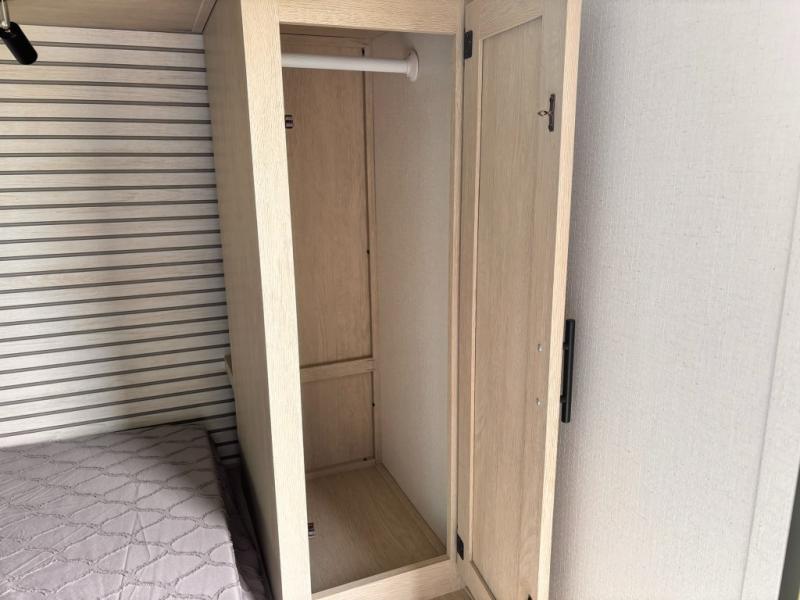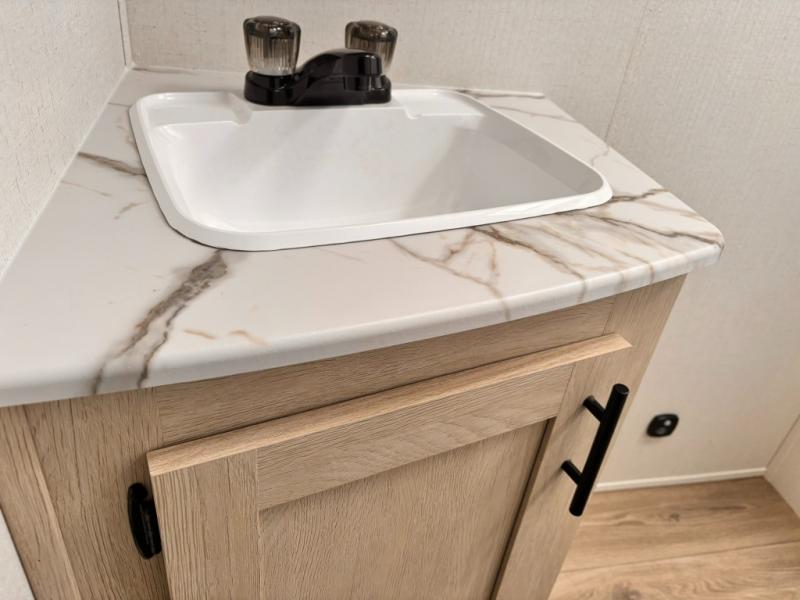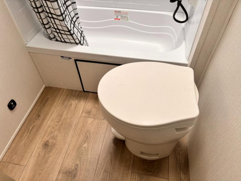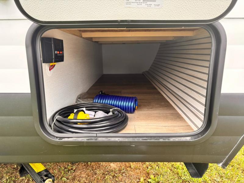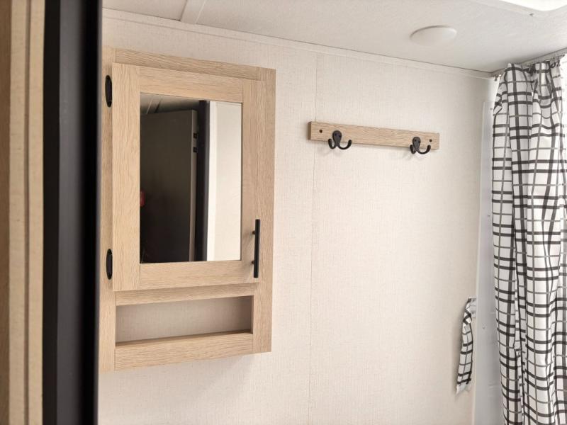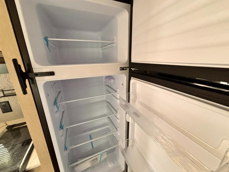 The double-size bunks found in this travel trailer will be perfect for guests, while you take the front RV queen bed! There is a full bath right beside the bunks for easy nighttime use, and the front bed includes a wardrobe at the foot of the bed for your things. Once the chef of your group has made lunch in the kitchen, you can dine at the booth dinette or take your plate outdoors to sit at the campground picnic table. There is also a kitchen pantry that is washer/dryer ready if you plan to add those appliances. This model also includes plenty of storage space, including an exterior pass-through for fishing poles, hiking gear, and more!