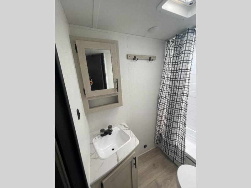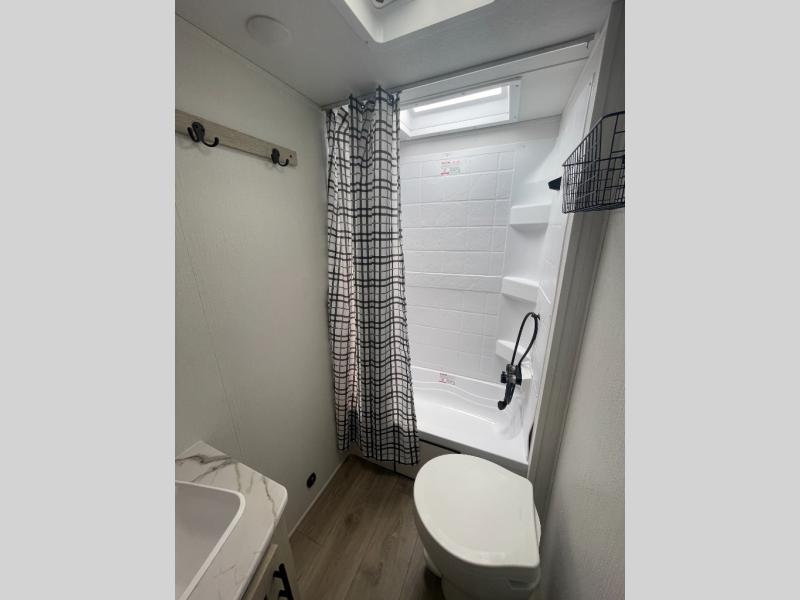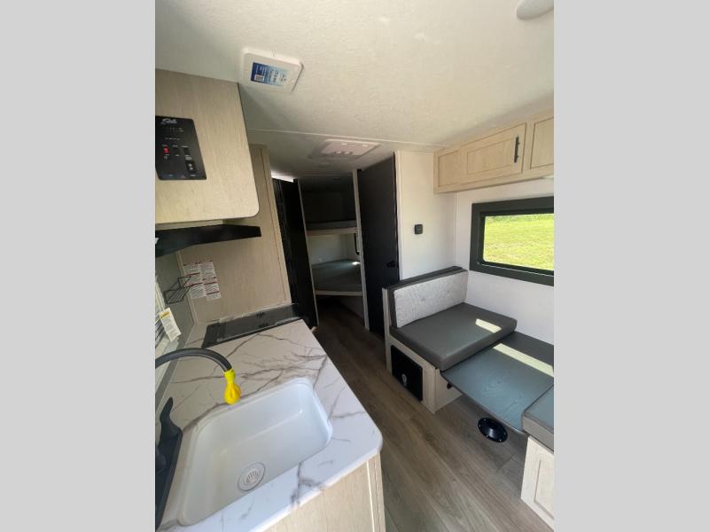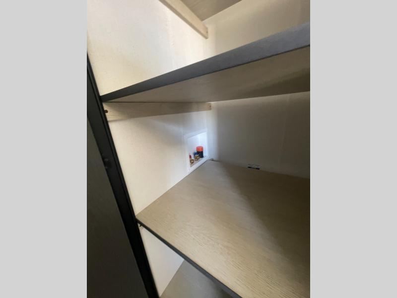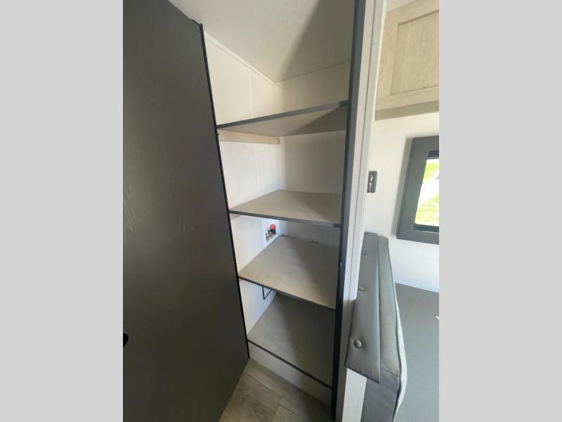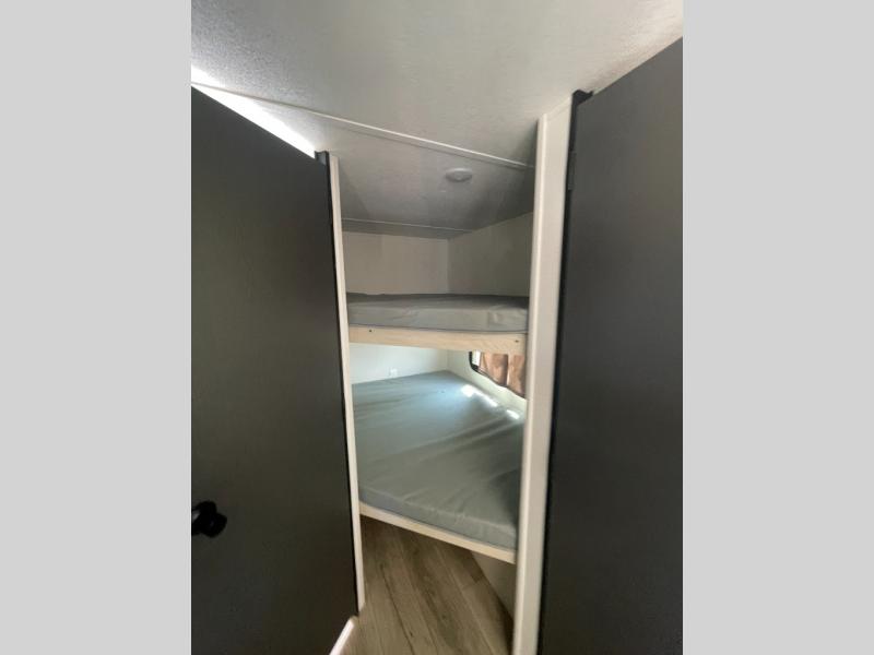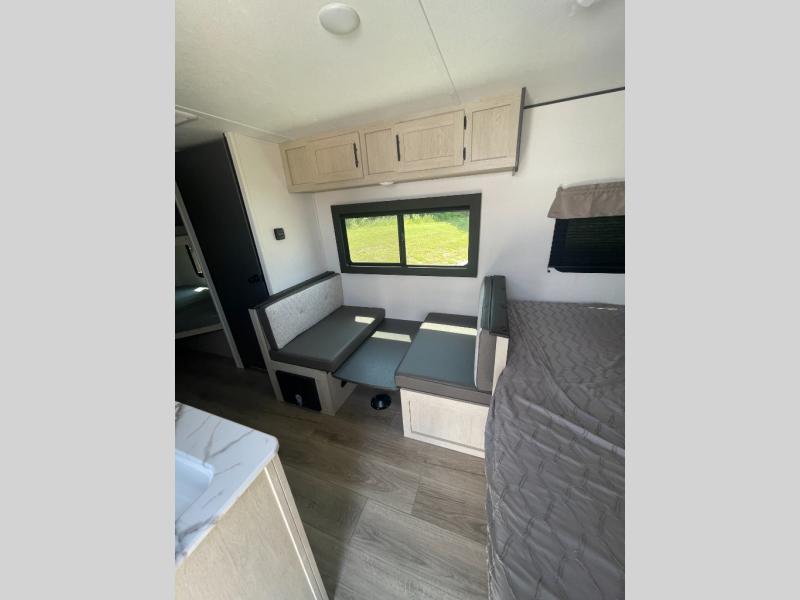 The double-size bunks found in this travel trailer will be perfect for guests, while you take the front RV queen bed! There is a full bath right beside the bunks for easy nighttime use, and the front bed includes a wardrobe at the foot of the bed for your things. Once the chef of your group has made lunch in the kitchen, you can dine at the booth dinette or take your plate outdoors to sit at the campground picnic table. There is also a kitchen pantry that is washer/dryer ready if you plan to add those appliances. This model also includes plenty of storage space, including an exterior pass-through for fishing poles, hiking gear, and more!