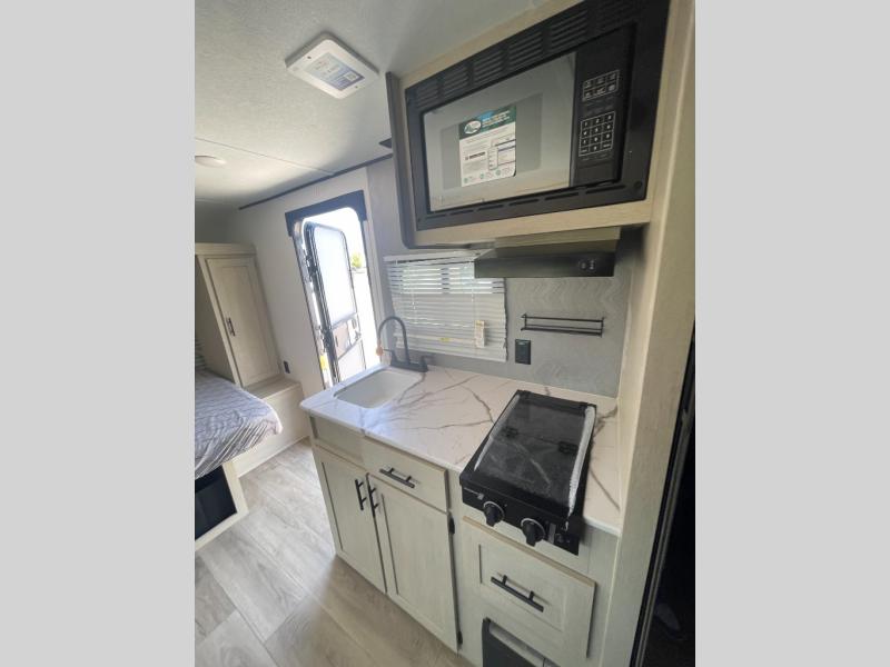 With any Compact travel trailer by Shasta RVs, you will enjoy the camping lifestyle in an easy-to-tow, lightweight unit! Each model includes four stabilizer jacks to keep your travel trailer secure at the campground, and an optional power tongue jack can be added for more convenience. You will appreciate having a tankless water heater for endless hot showers, an 8K BTU A/C to keep you cool, plus solar and back-up camera prep. The interior of each Compact travel trailer includes seamless countertops, kitchen and bath amenities, a Bluetooth portable speaker, plus storage space for all your belongings.