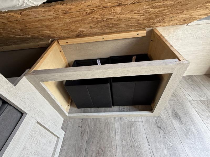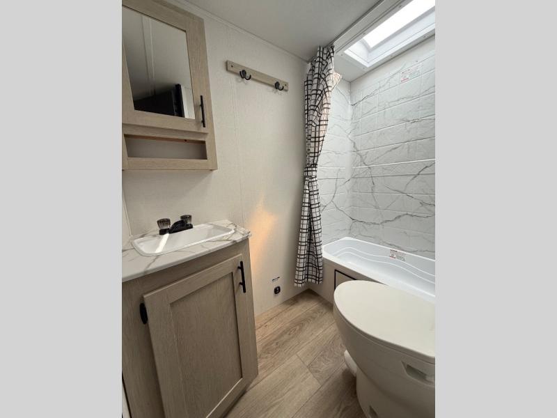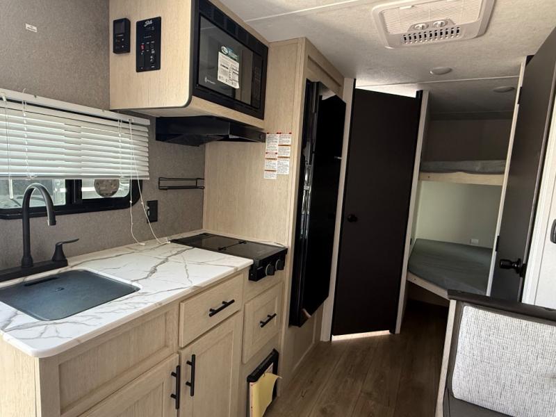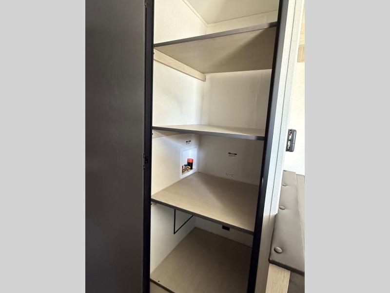 The double-size bunks found in this travel trailer will be perfect for guests, while you take the front RV queen bed! There is a full bath right beside the bunks for easy nighttime use, and the front bed includes a wardrobe at the foot of the bed for your things. Once the chef of your group has made lunch in the kitchen, you can dine at the booth dinette or take your plate outdoors to sit at the campground picnic table. There is also a kitchen pantry that is washer/dryer ready if you plan to add those appliances. This model also includes plenty of storage space, including an exterior pass-through for fishing poles, hiking gear, and more!