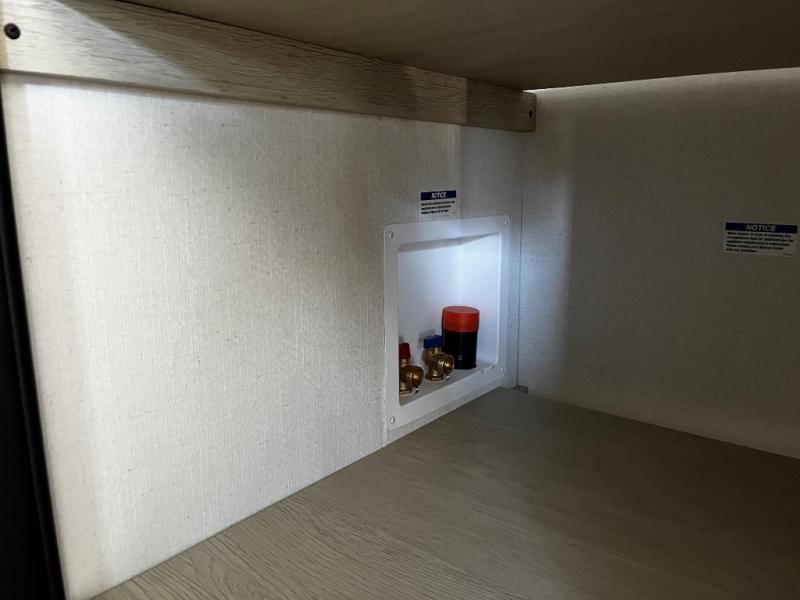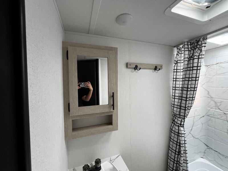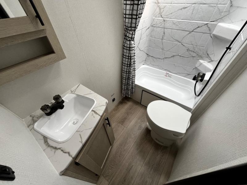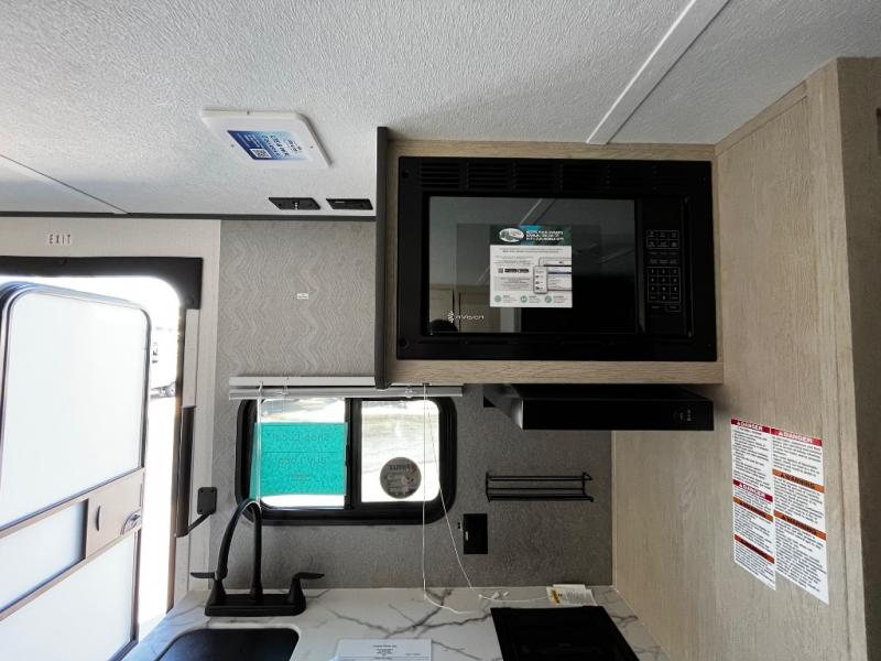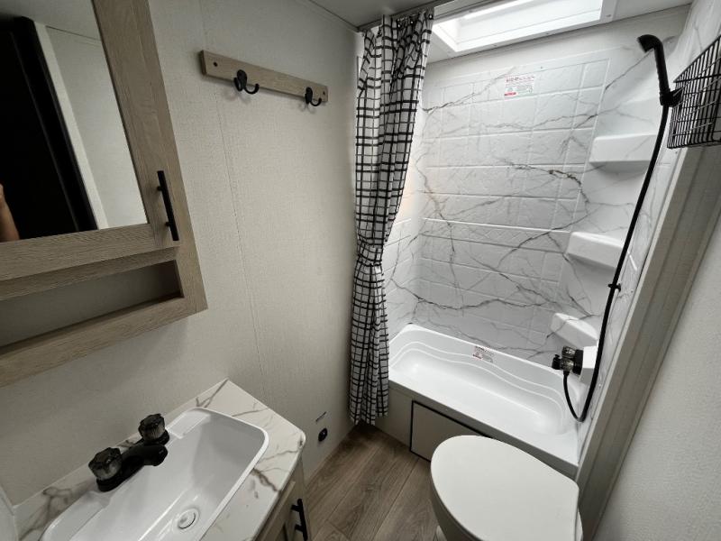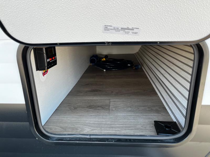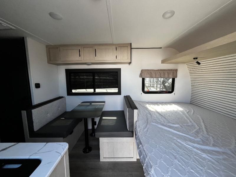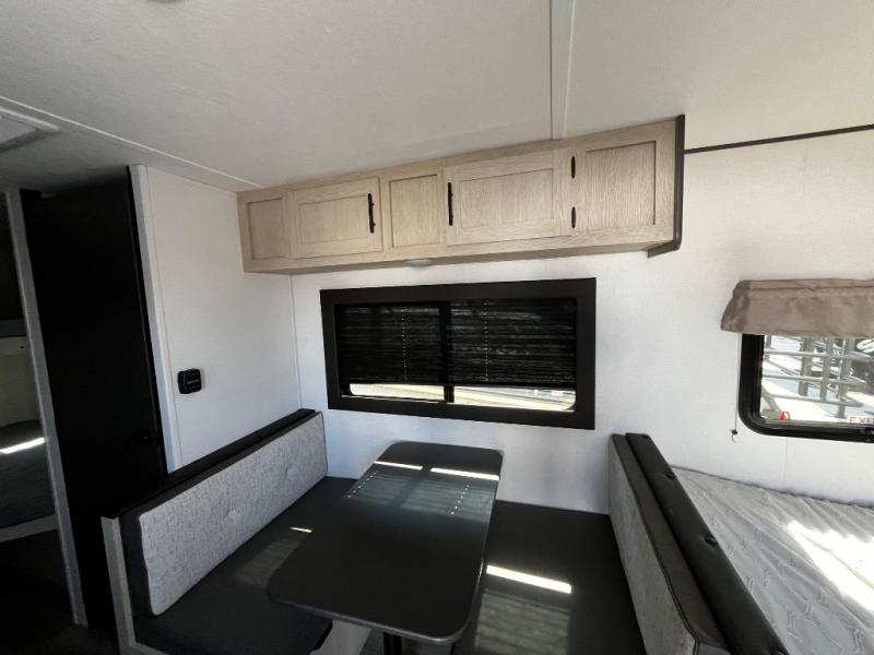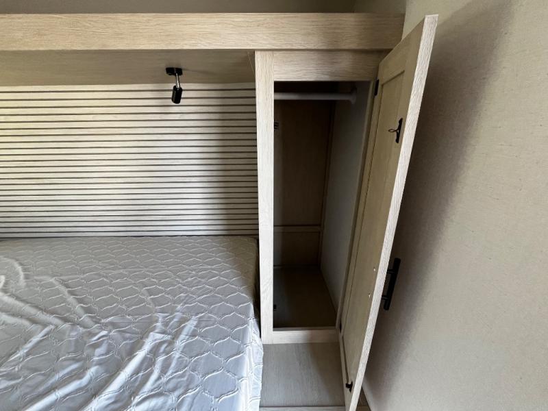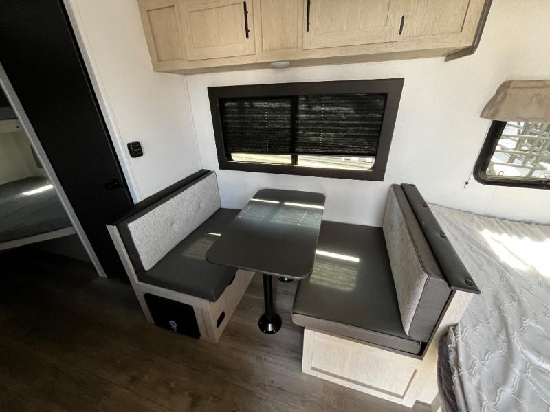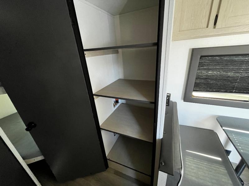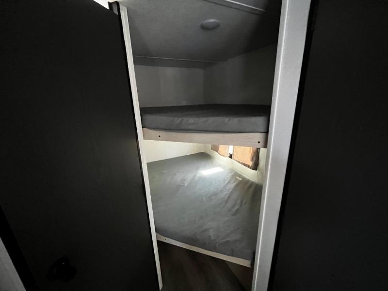 The double-size bunks found in this travel trailer will be perfect for guests, while you take the front RV queen bed! There is a full bath right beside the bunks for easy nighttime use, and the front bed includes a wardrobe at the foot of the bed for your things. Once the chef of your group has made lunch in the kitchen, you can dine at the booth dinette or take your plate outdoors to sit at the campground picnic table. There is also a kitchen pantry that is washer/dryer ready if you plan to add those appliances. This model also includes plenty of storage space, including an exterior pass-through for fishing poles, hiking gear, and more!