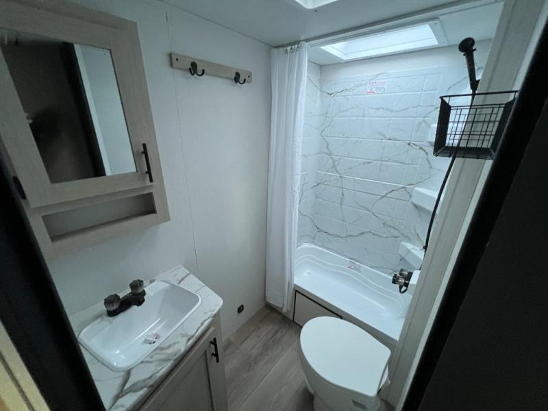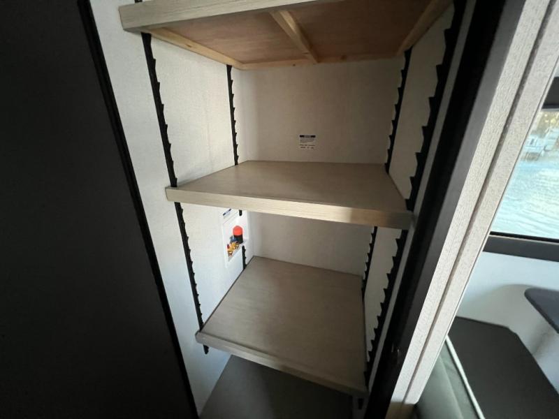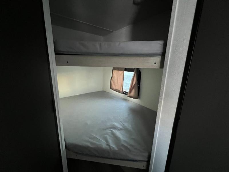 The double-size bunks found in this travel trailer will be perfect for guests, while you take the front RV queen bed! There is a full bath right beside the bunks for easy nighttime use, and the front bed includes a wardrobe at the foot of the bed for your things. Once the chef of your group has made lunch in the kitchen, you can dine at the booth dinette or take your plate outdoors to sit at the campground picnic table. There is also a kitchen pantry that is washer/dryer ready if you plan to add those appliances. This model also includes plenty of storage space, including an exterior pass-through for fishing poles, hiking gear, and more!