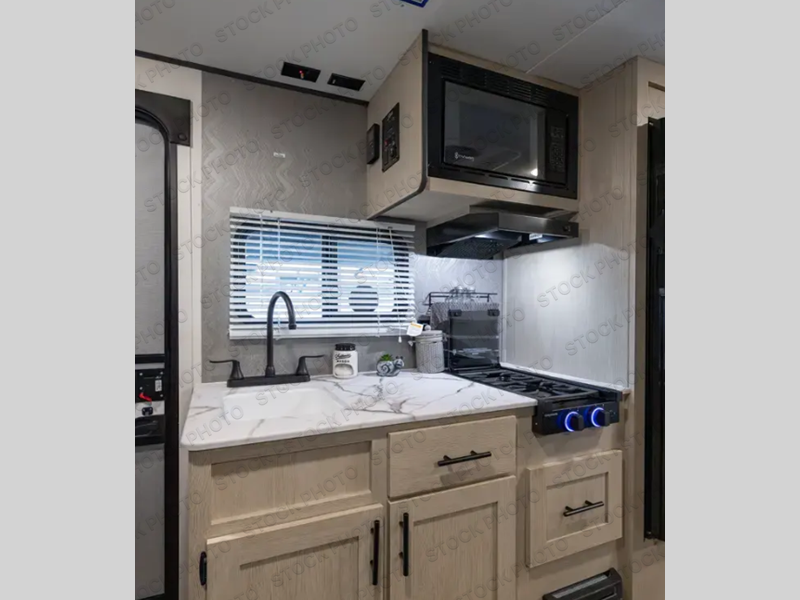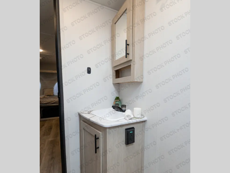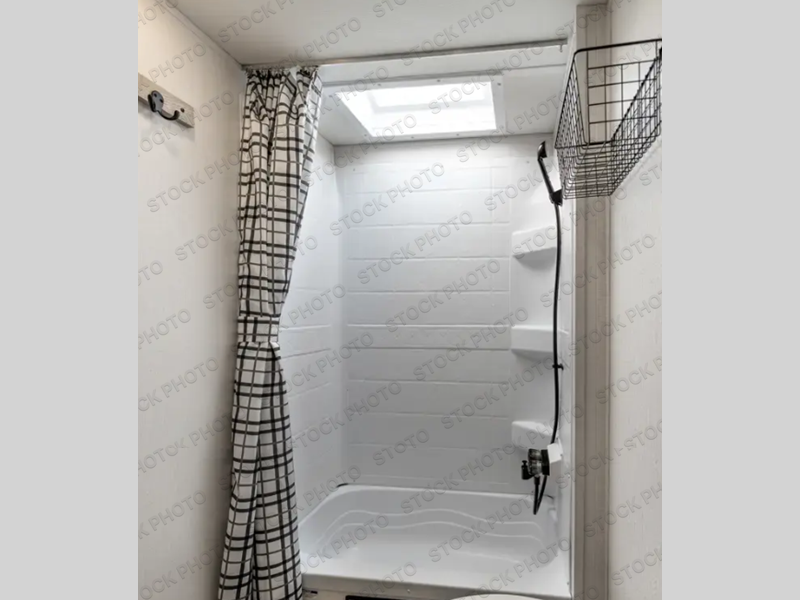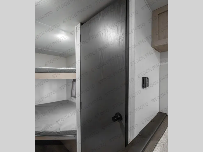 The double-size bunks found in this travel trailer will be perfect for guests, while you take the front RV queen bed! There is a full bath right beside the bunks for easy nighttime use, and the front bed includes a wardrobe at the foot of the bed for your things. Once the chef of your group has made lunch in the kitchen, you can dine at the dinette or take your plate outdoors to sit at the campground picnic table. There is also a kitchen pantry that is washer/dryer ready if you plan to add those appliances. This model also includes plenty of storage space, including an exterior storage compartment for fishing poles, hiking gear, and more!