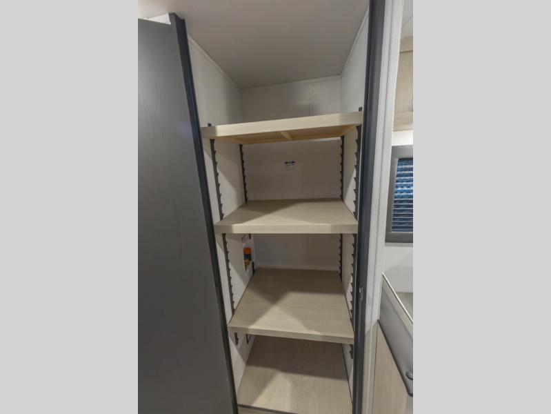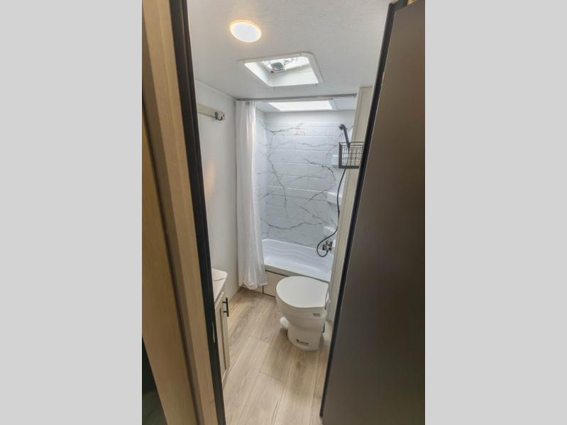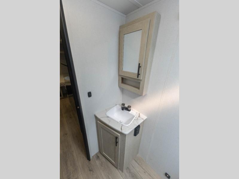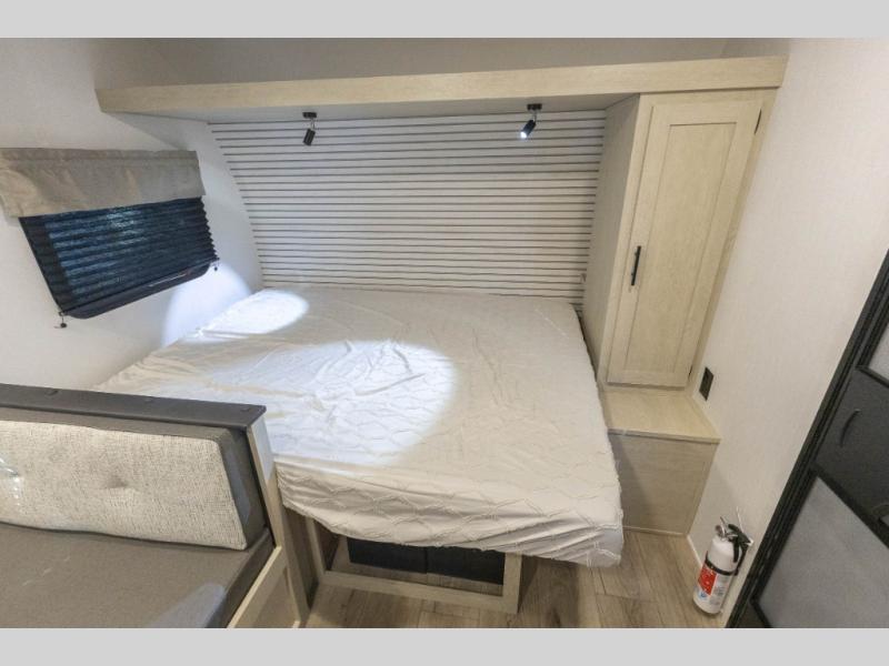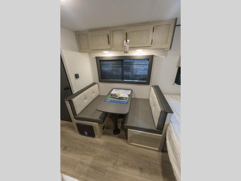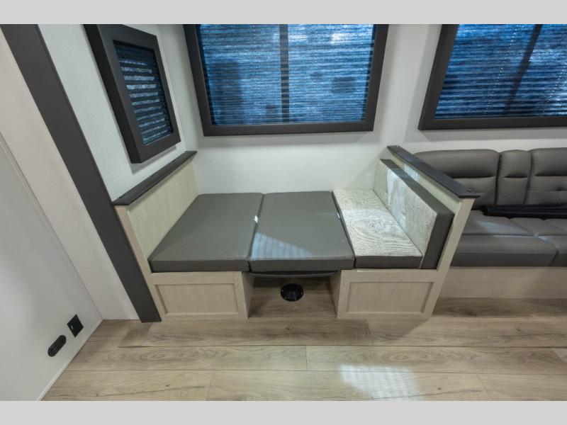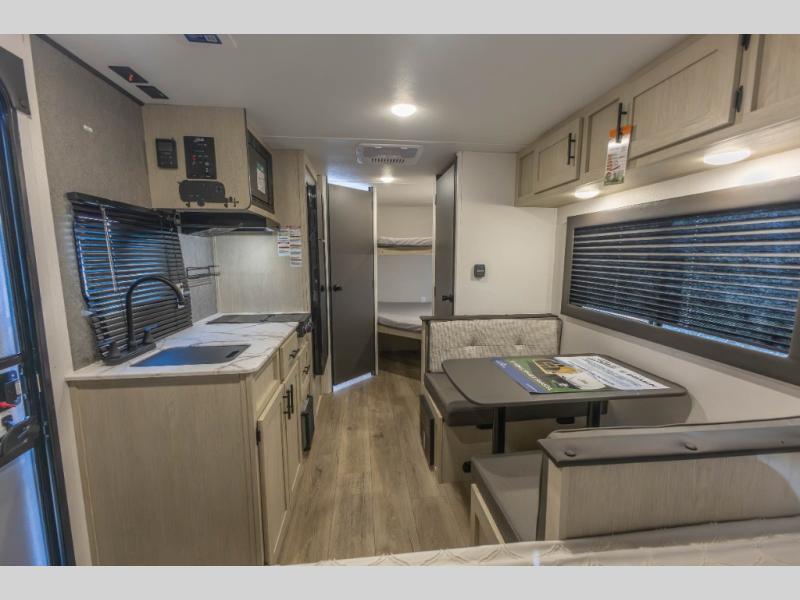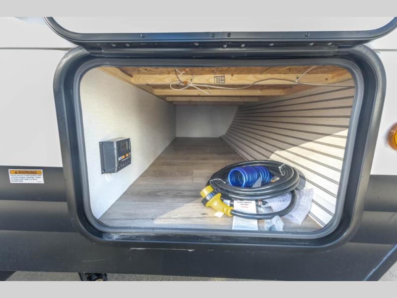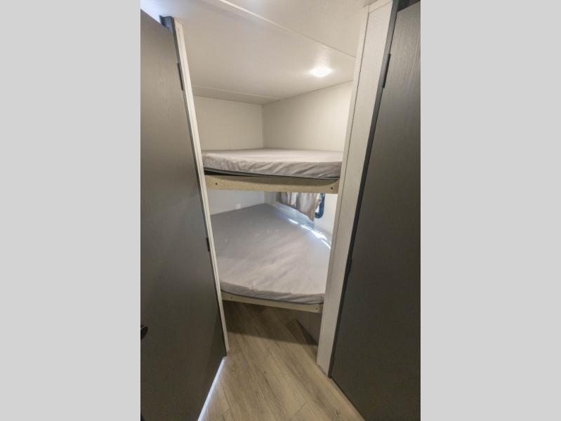 The double-size bunks found in this travel trailer will be perfect for guests, while you take the front queen bed! There is a full bath right beside the bunks for easy nighttime use, and the front bed includes a wardrobe at the foot of the bed for your things. Once the chef of your group has made lunch in the kitchen, you can dine at the dinette or take your plate outdoors to sit at the campground picnic table. There is also a kitchen pantry that is washer/dryer ready if you plan to add those appliances. This model also includes plenty of storage space, including an exterior storage compartment for fishing poles, hiking gear, and more!