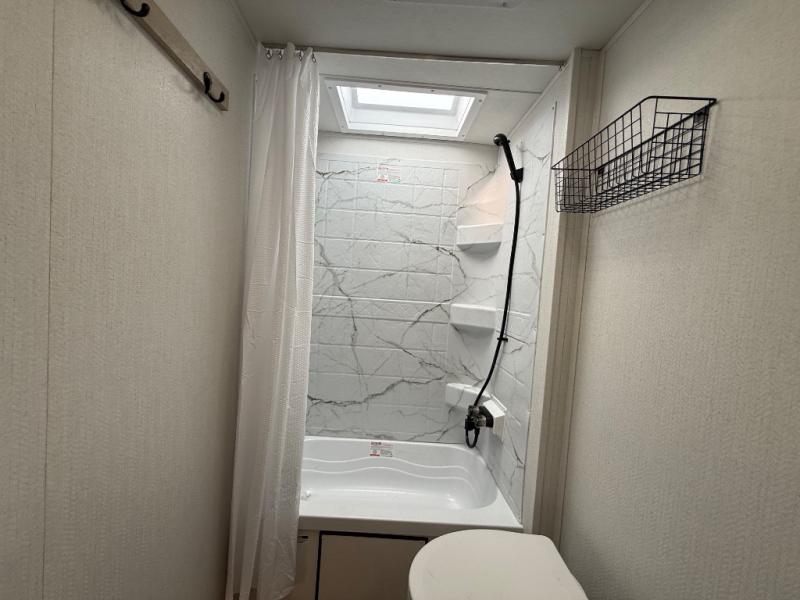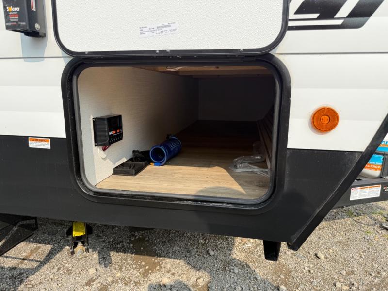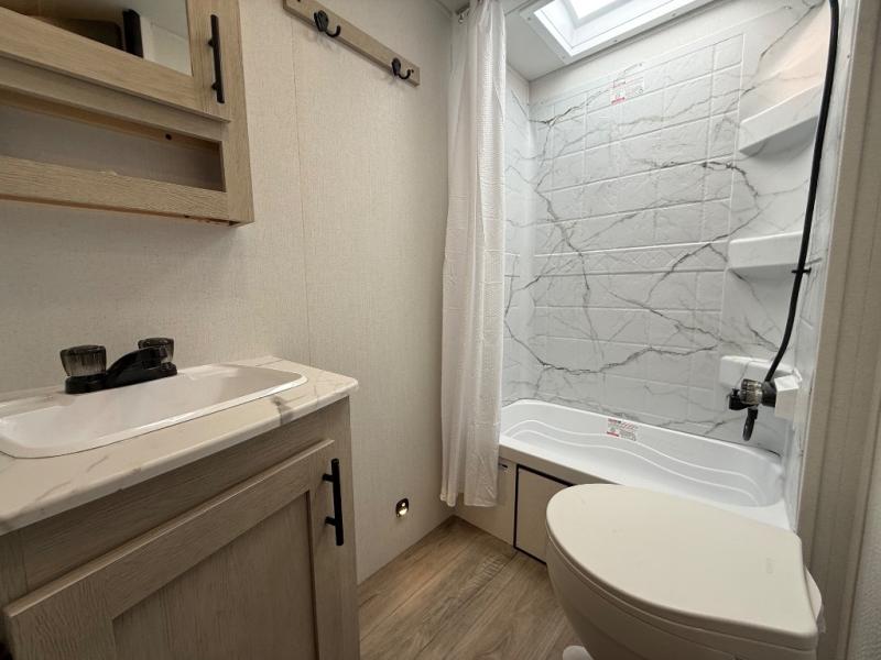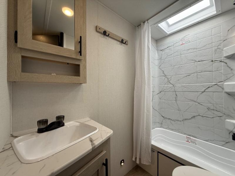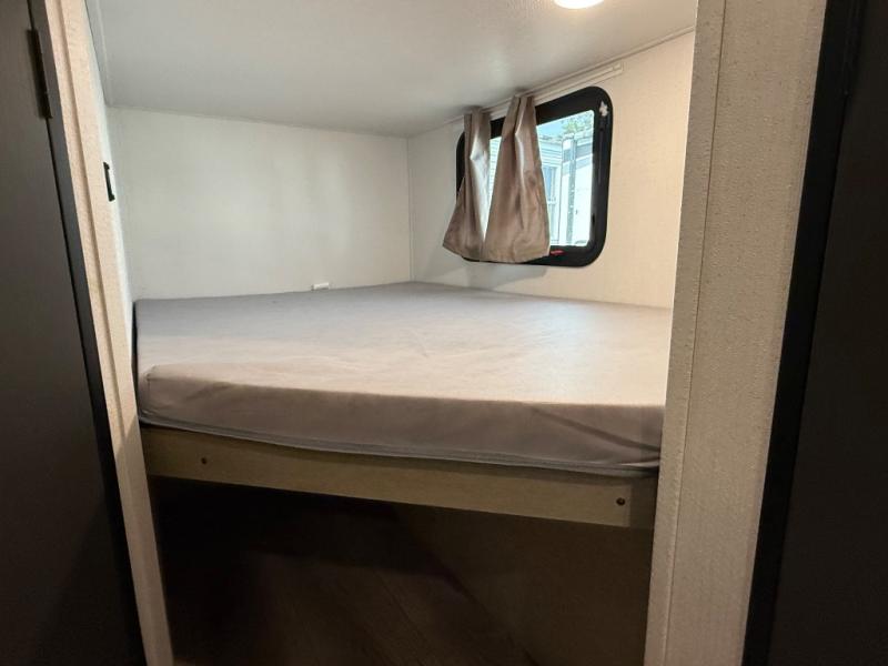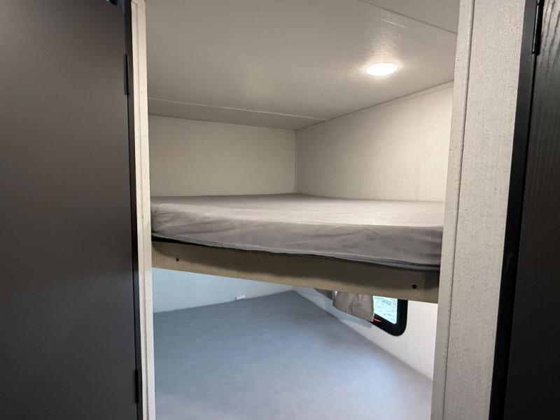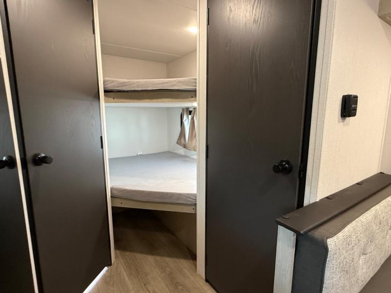 The double-size bunks found in this travel trailer will be perfect for guests, while you take the front queen bed! There is a full bath right beside the bunks for easy nighttime use, and the front bed includes a wardrobe at the foot of the bed for your things. Once the chef of your group has made lunch in the kitchen, you can dine at the dinette or take your plate outdoors to sit at the campground picnic table. There is also a kitchen pantry that is washer/dryer ready if you plan to add those appliances. This model also includes plenty of storage space, including an exterior storage compartment for fishing poles, hiking gear, and more!