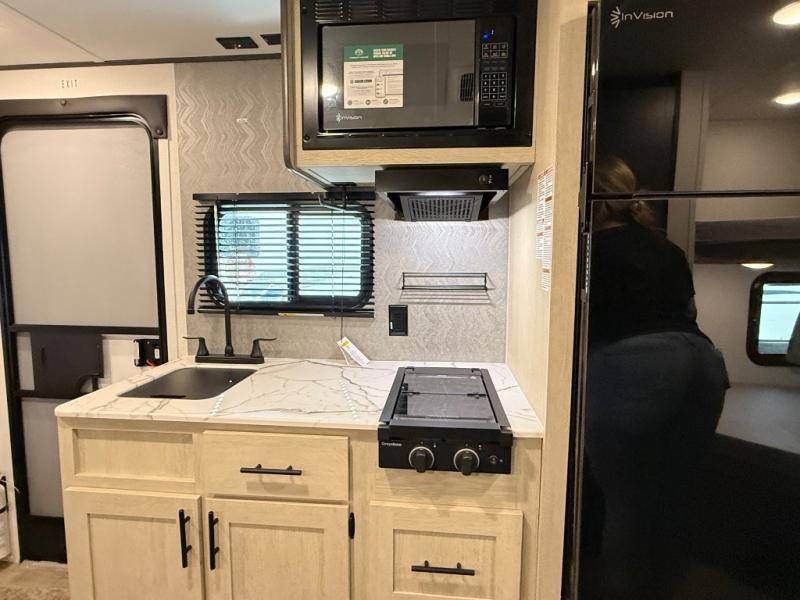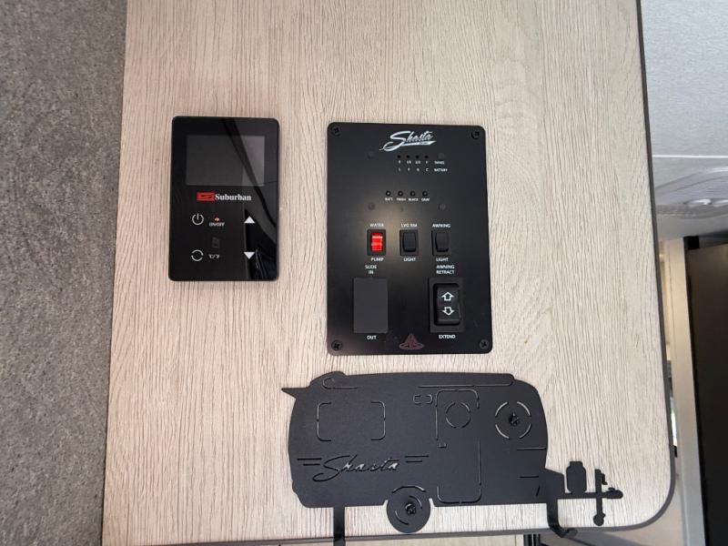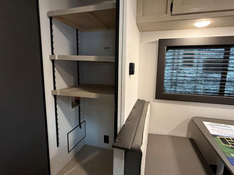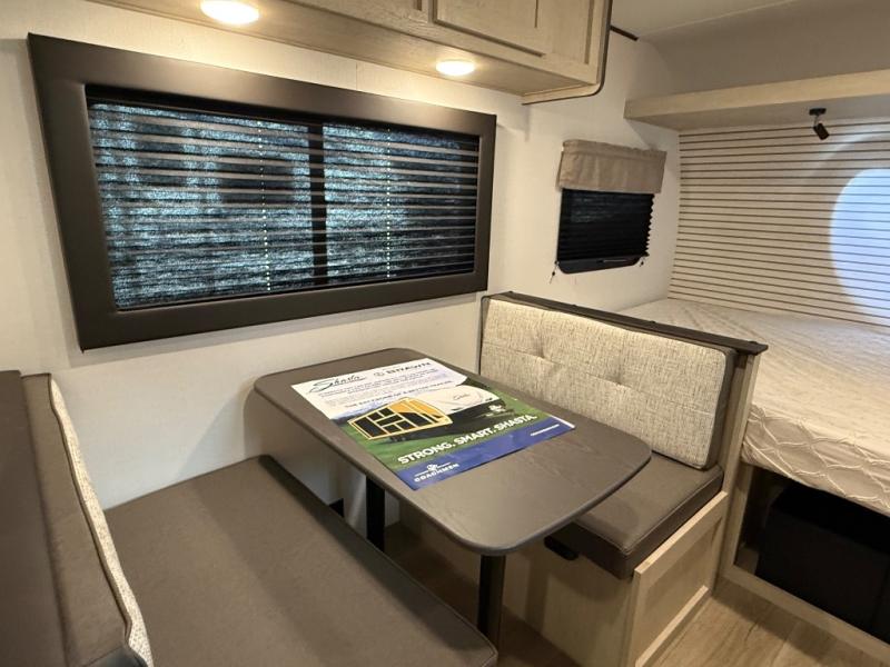 With any Shasta Compact travel trailer, you’re getting core comforts and practical upgrades across the line. Every model includes the Compact Package with a tankless water heater, 8,000 BTU roof A/C, 8 cu. ft. refrigerator, Bluetooth portable speaker, battery disconnect, black tank flush, 20-lb LP bottle, and a spare tire. Construction highlights include Tufflex PVC roof material, R-7 fiberglass insulation in walls, floor, and roof, and an 8' exterior width on all models. For campsite convenience, you’ll find LED interior lights, USB charging stations, under-bed storage with baskets, a range hood with exhaust fan, a decorative backsplash, motion-sensor lights, and skylights.