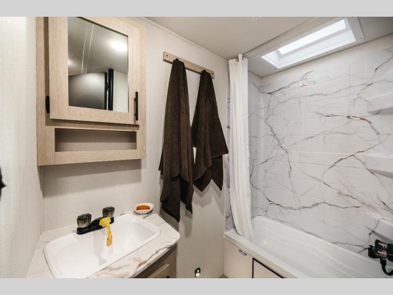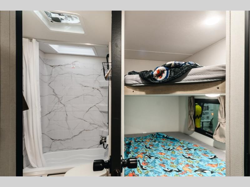 The double-size bunks found in this travel trailer will be perfect for guests, while you take the front queen bed! There is a full bath right beside the bunks for easy nighttime use, and the front bed includes a wardrobe at the foot of the bed for your things. Once the chef of your group has made lunch in the kitchen, you can dine at the dinette or take your plate outdoors to sit at the campground picnic table. There is also a kitchen pantry that is washer/dryer ready if you plan to add those appliances. This model also includes plenty of storage space, including an exterior storage compartment for fishing poles, hiking gear, and more!