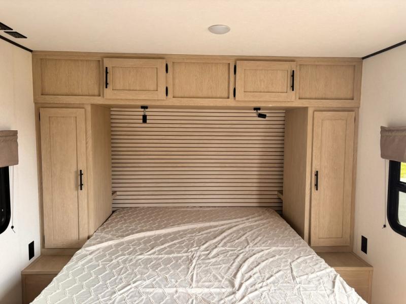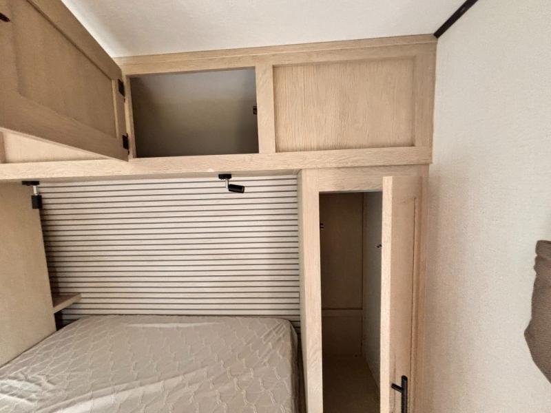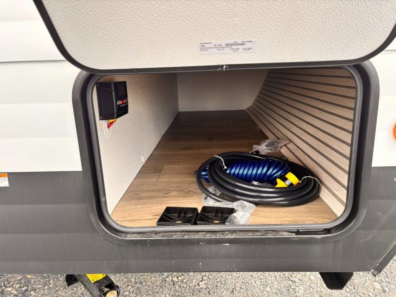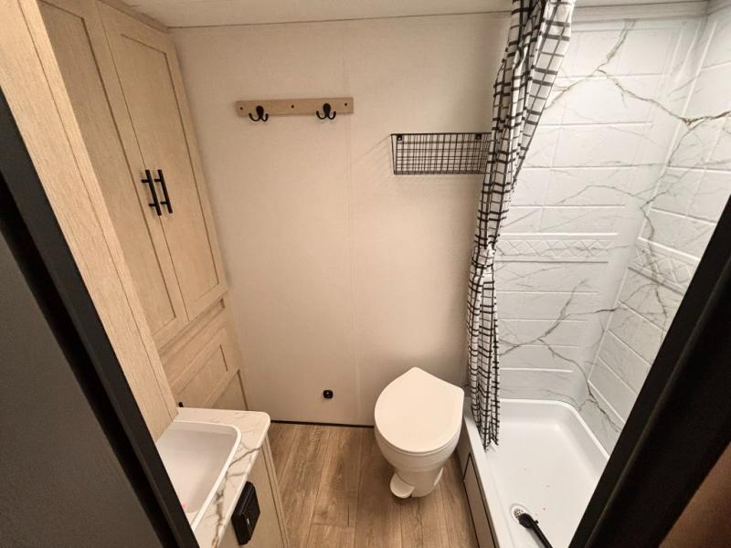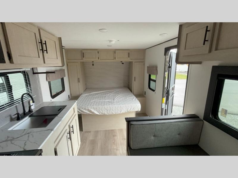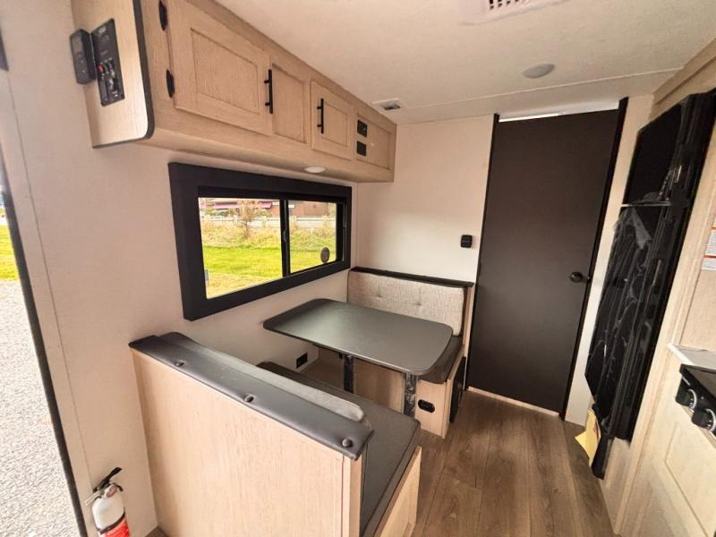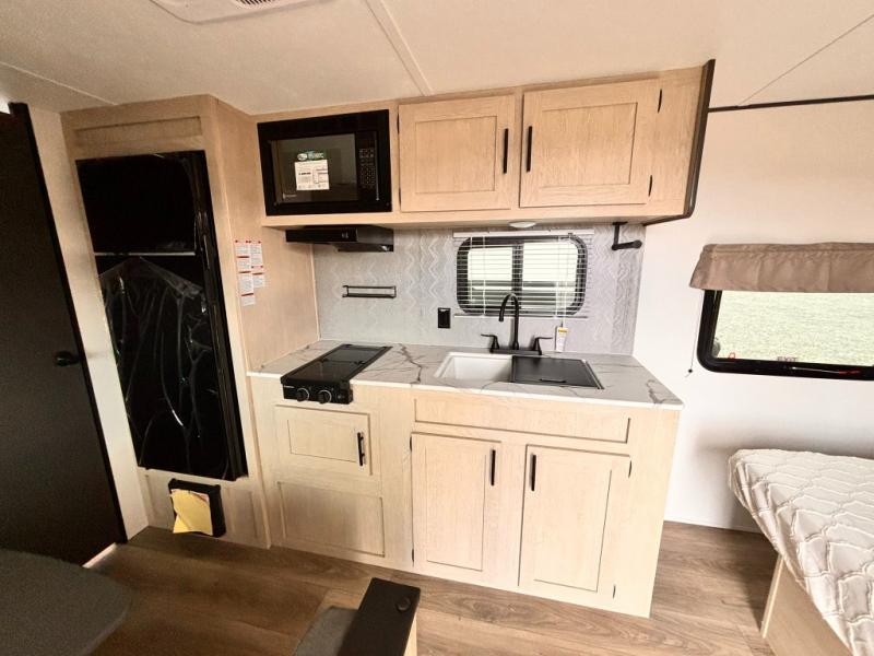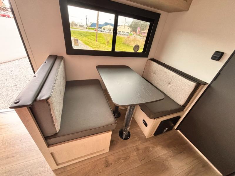This travel trailer will feel just like home since there is a front bedroom with an RV queen bed, dual wardrobes to keep your clothes tidy, plus a spacious full rear bath. There is a 24" x 40 shower pan here, plus a medicine cabinet and a spacious bath linen closet to keep clean towels close by. Head to the kitchen to prepare lunch on the two burner cooktop or use the microwave cabinet to heat up leftovers. There is a booth dinette where you can dine together and even let an overnight guests or two littles ones sleep on!