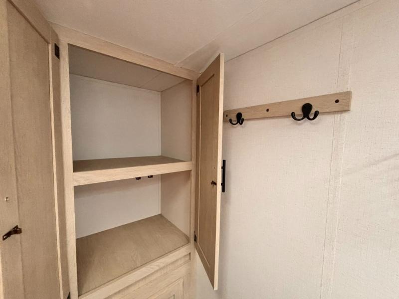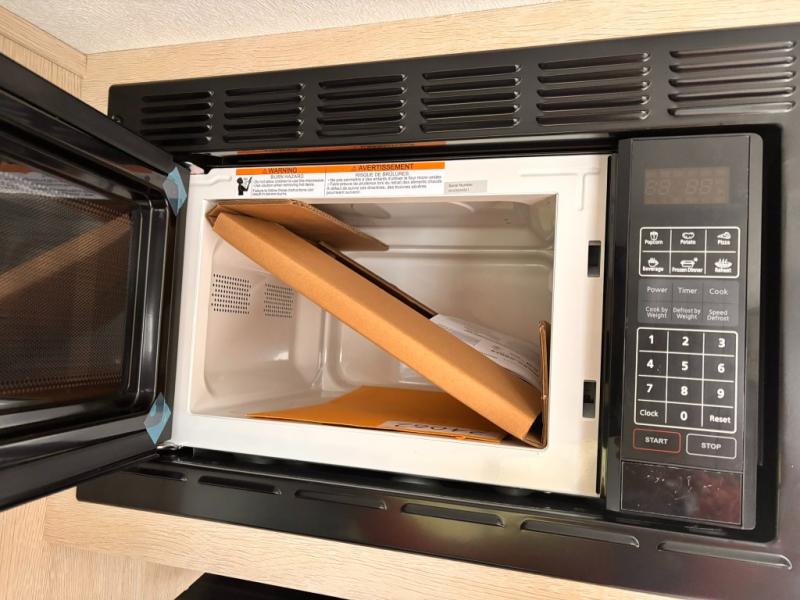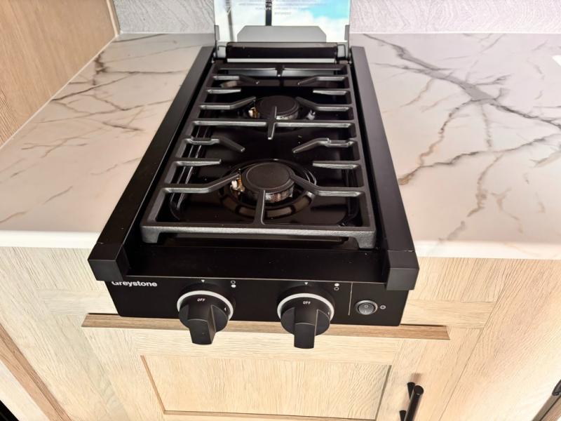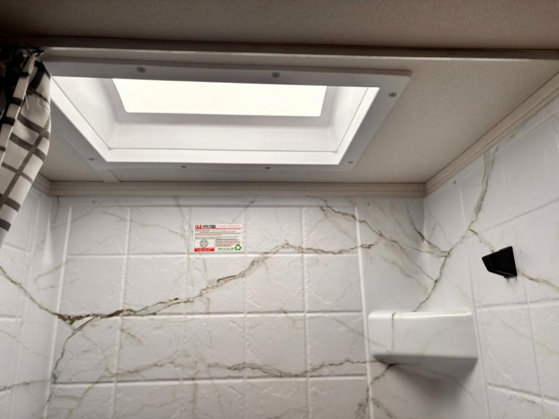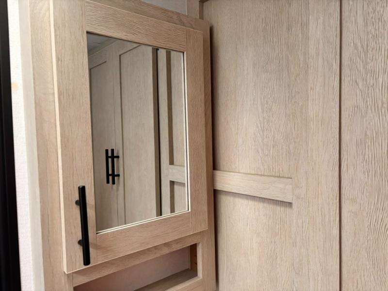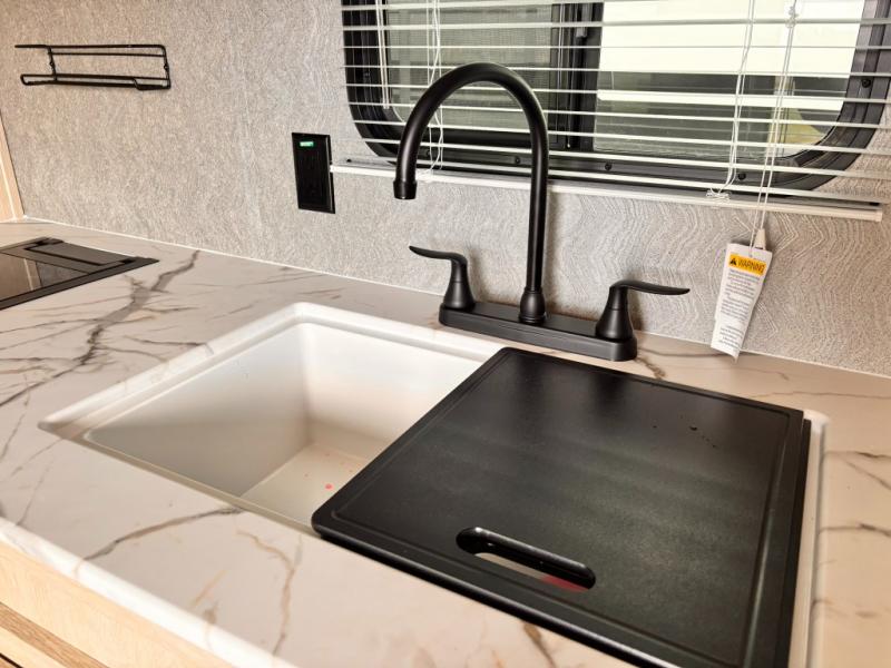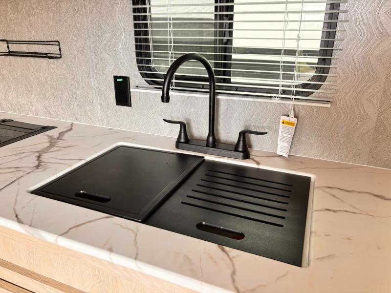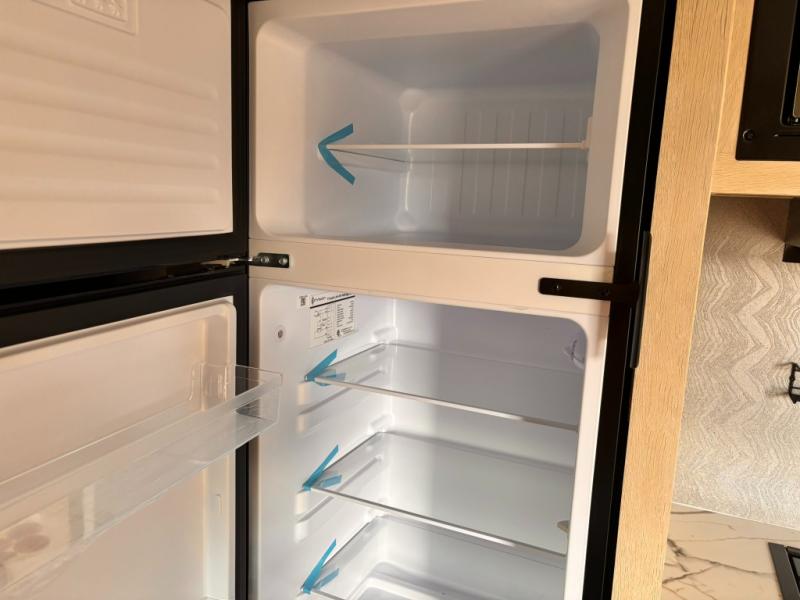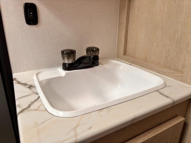 This travel trailer will feel just like home since there is a front bedroom with an RV queen bed, dual wardrobes to keep your clothes tidy, plus a spacious full rear bath. There is a 24" x 40 shower pan here, plus a medicine cabinet and a spacious bath linen closet to keep clean towels close by. Head to the kitchen to prepare lunch on the two burner cooktop or use the microwave cabinet to heat up leftovers. There is a booth dinette where you can dine together and even let an overnight guests or two littles ones sleep on!