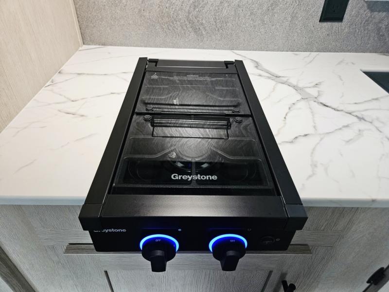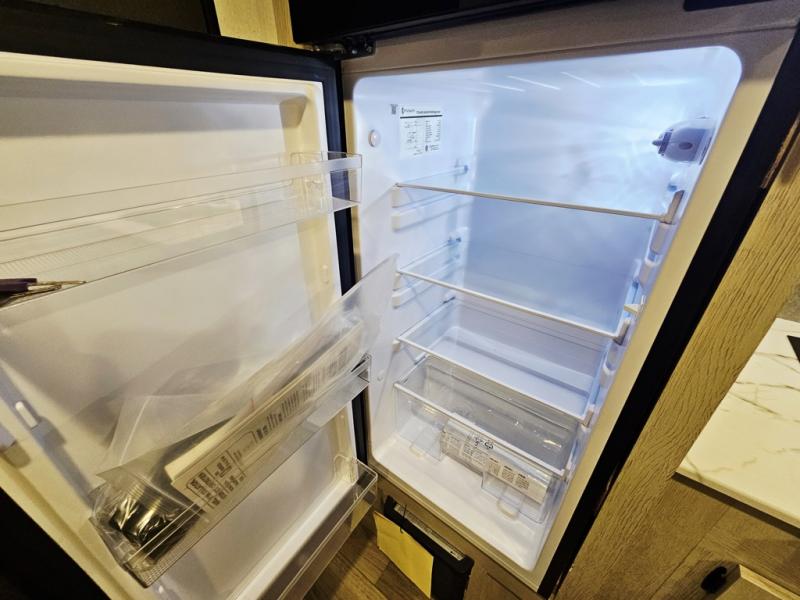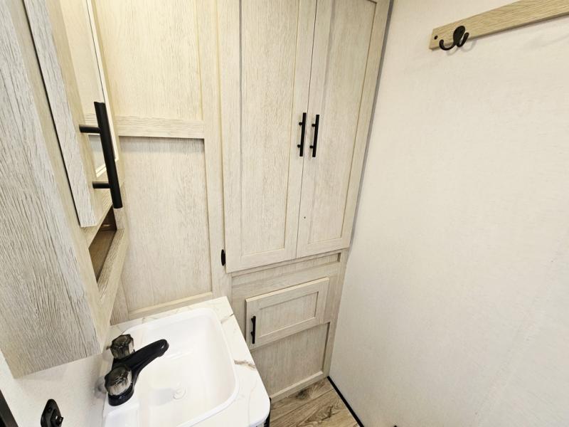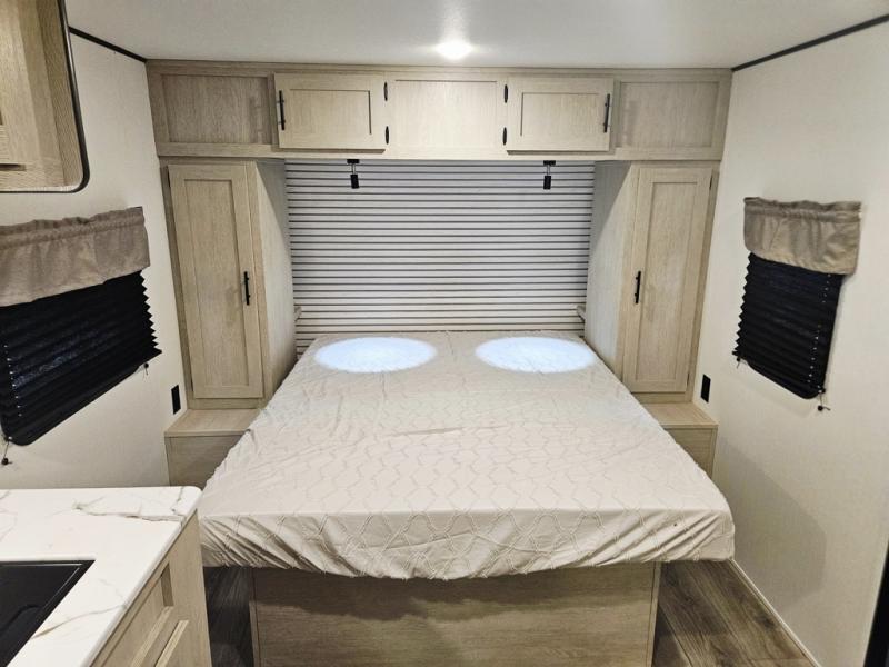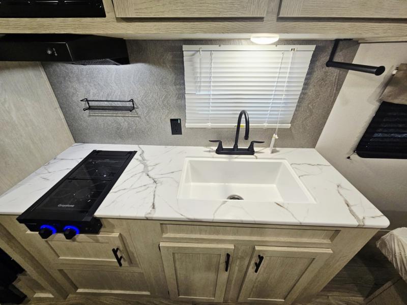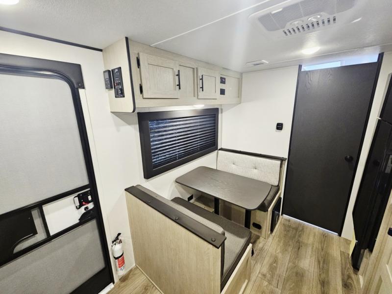 This travel trailer will feel just like home since there is a front bedroom with an RV queen bed, dual wardrobes to keep your clothes tidy, plus a spacious full rear bath. There is a 24" x 40 shower pan here, plus a medicine cabinet and a spacious bath linen closet to keep clean towels close by. Head to the kitchen to prepare lunch on the two burner cooktop or use the microwave cabinet to heat up leftovers. There is a booth dinette where you can dine together and even let an overnight guests or two littles ones sleep on!