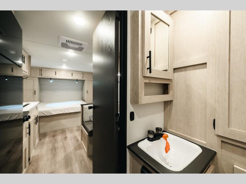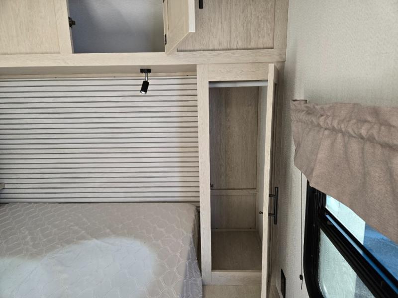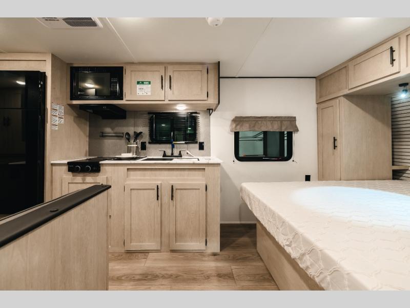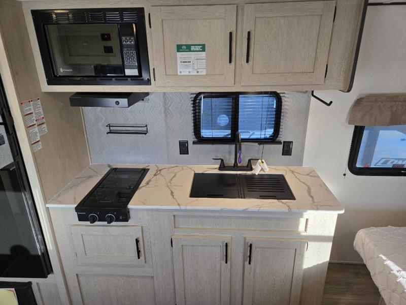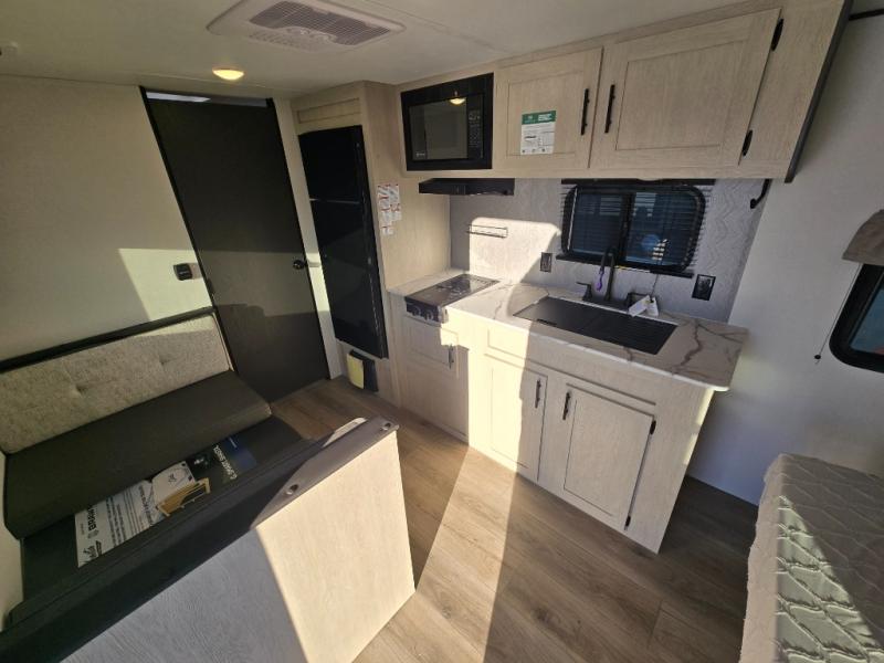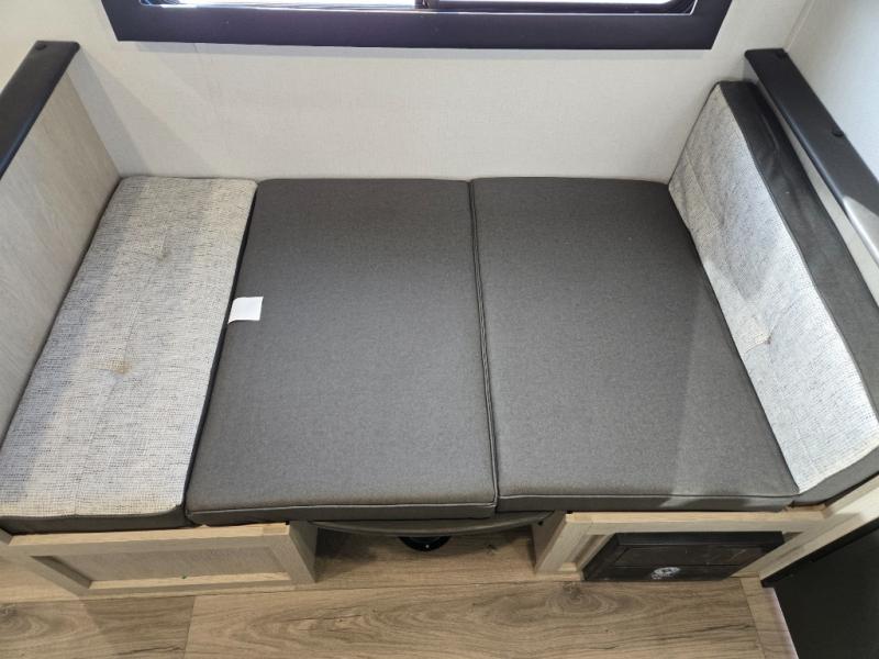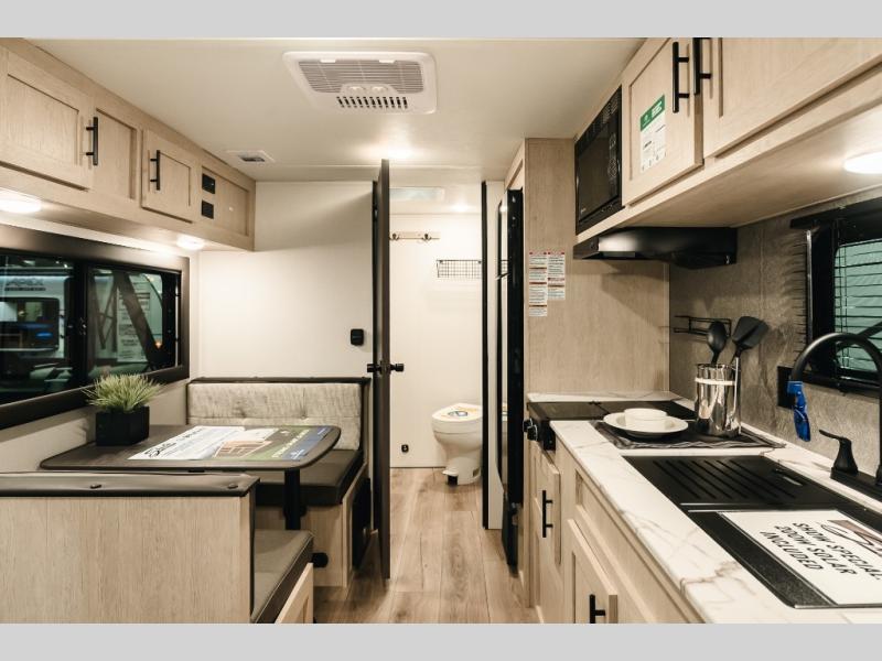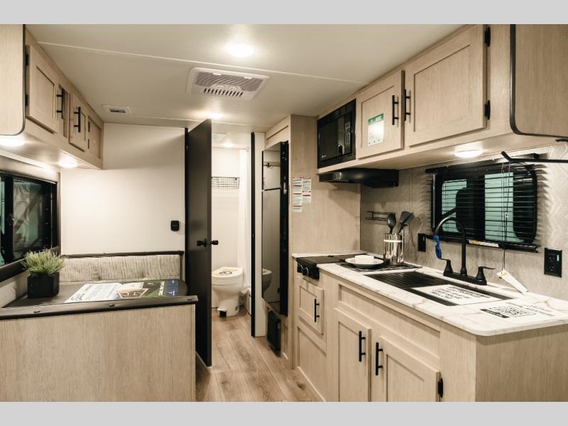 This travel trailer will feel just like home since there is a front bedroom with an RV queen bed, dual wardrobes to keep your clothes tidy, plus a spacious full rear bath. There is a 24" x 40 shower pan here, plus a medicine cabinet and a spacious bath linen closet to keep clean towels close by. Head to the kitchen to prepare lunch on the two burner cooktop or use the microwave cabinet to heat up leftovers. There is a booth dinette where you can dine together and even let an overnight guests or two littles ones sleep on!