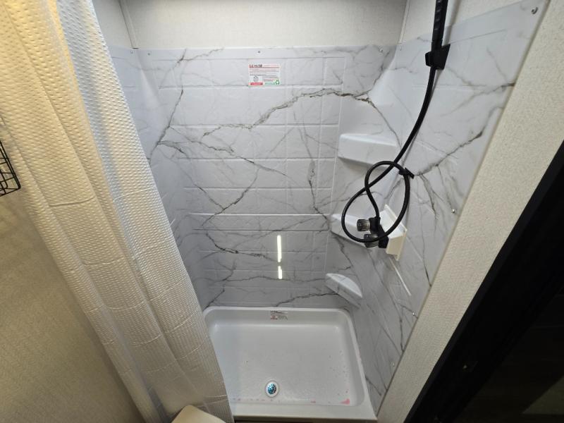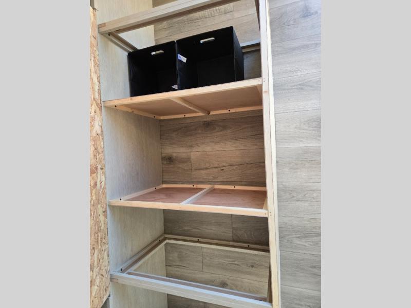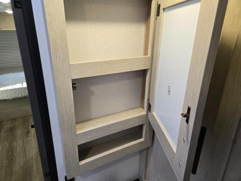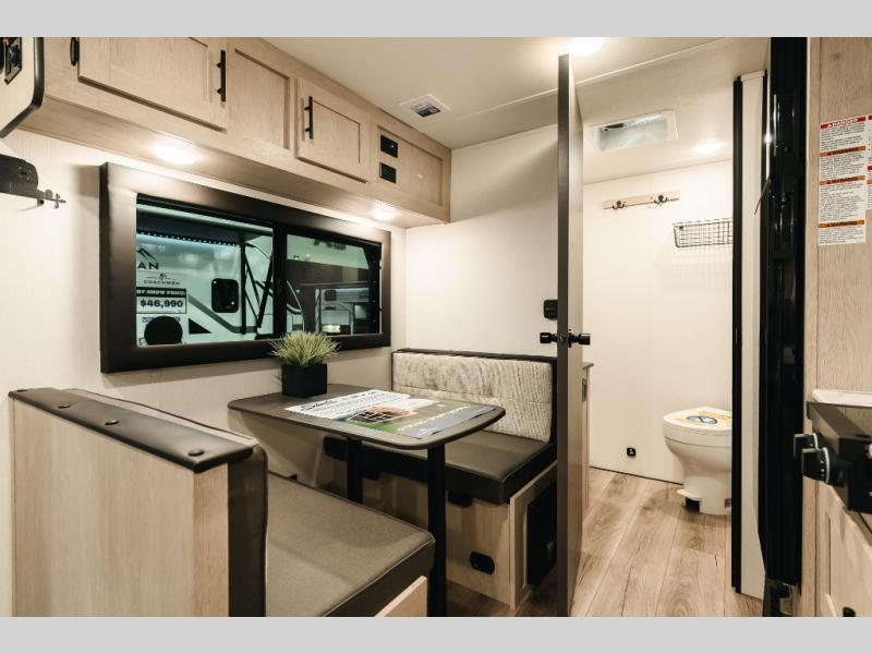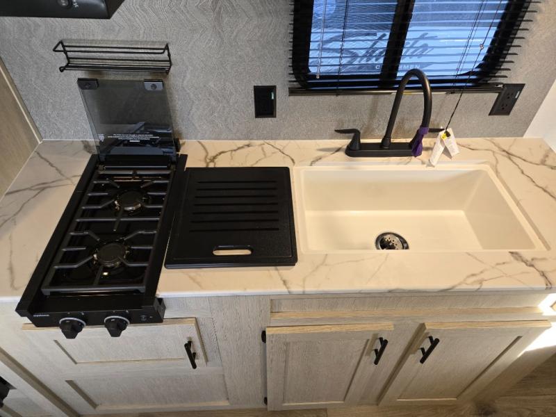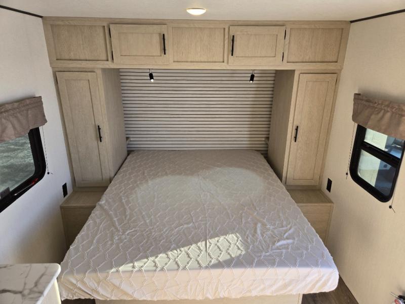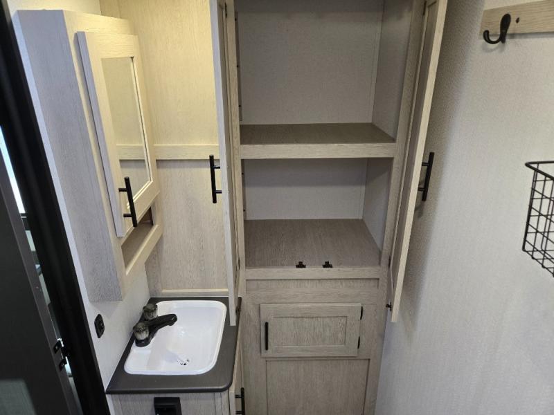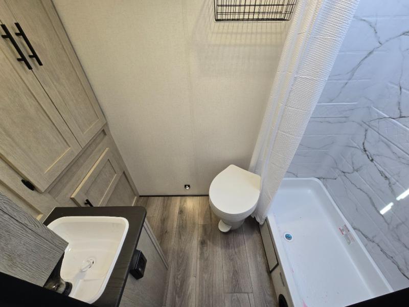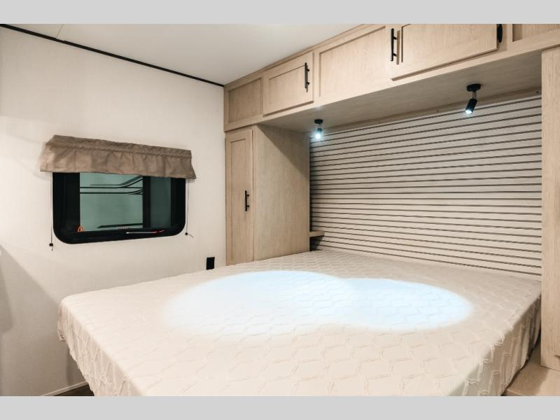 This travel trailer will feel just like home since there is a front bedroom with an RV queen bed, dual wardrobes to keep your clothes tidy, plus a spacious full rear bath. There is a 24" x 40 shower pan here, plus a medicine cabinet and a spacious bath linen closet to keep clean towels close by. Head to the kitchen to prepare lunch on the two burner cooktop or use the microwave cabinet to heat up leftovers. There is a booth dinette where you can dine together and even let an overnight guests or two littles ones sleep on!