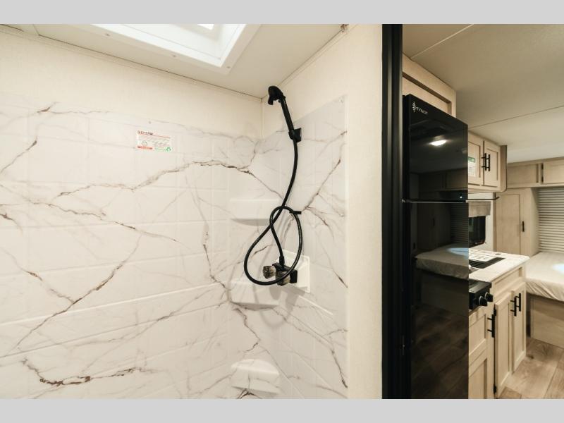 With any Compact travel trailer by Shasta RVs, you will enjoy the camping lifestyle in an easy-to-tow, lightweight unit! Each model includes four stabilizer jacks to keep your travel trailer secure at the campground, and an optional power tongue jack can be added for more convenience. You will appreciate having a tankless water heater for endless hot showers, an 8K BTU A/C to keep you cool, plus solar and back-up camera prep. The interior of each Compact travel trailer includes seamless countertops, kitchen and bath amenities, a Bluetooth portable speaker, plus storage space for all your belongings.