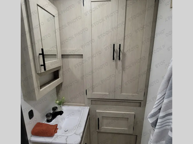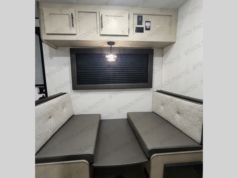 This travel trailer will feel just like home since there is a front bedroom with an RV queen bed, dual wardrobes to keep your clothes tidy, plus a spacious full rear bath. There is a 24" x 40 shower pan here, plus a medicine cabinet and a spacious bath linen closet to keep clean towels close by. Head to the kitchen to prepare lunch on the two burner cooktop or use the microwave cabinet to heat up leftovers. There is a booth dinette where you can dine together and even let an overnight guests or two littles ones sleep on!