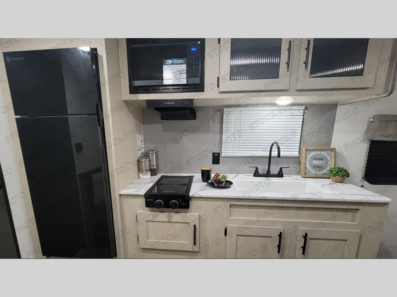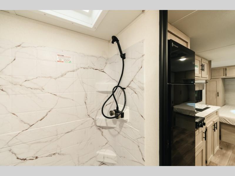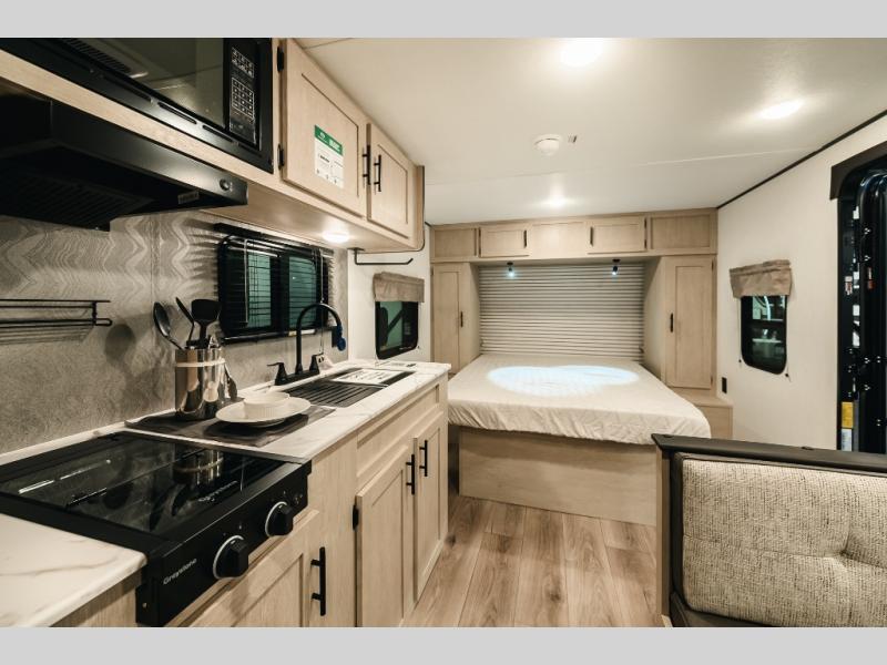 This travel trailer will feel just like home since there is a front bedroom with an RV queen bed, dual wardrobes to keep your clothes tidy, plus a spacious full rear bath. There is a 24" x 40 shower pan here, plus a medicine cabinet and a spacious bath linen closet to keep clean towels close by. Head to the kitchen to prepare lunch on the two burner cooktop or use the microwave cabinet to heat up leftovers. There is a booth dinette where you can dine together and even let an overnight guests or two littles ones sleep on!