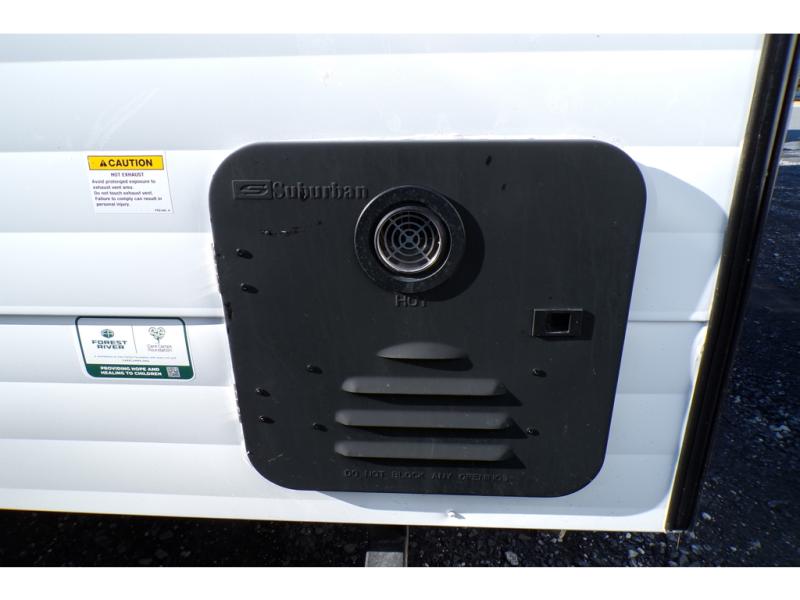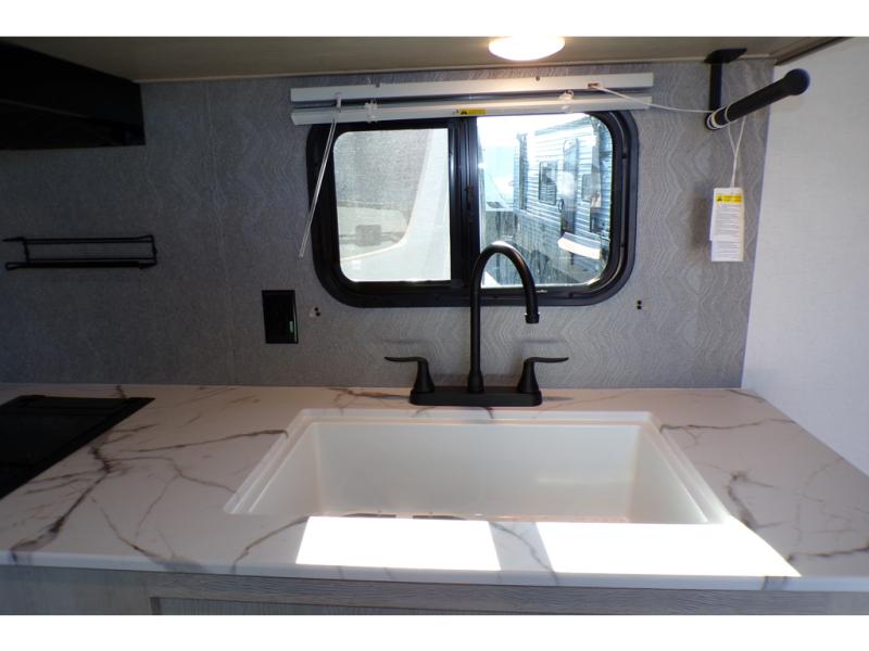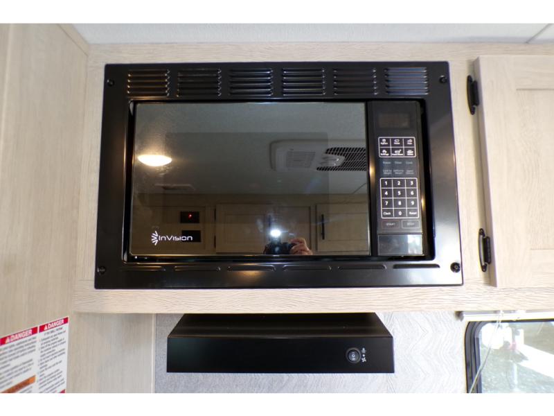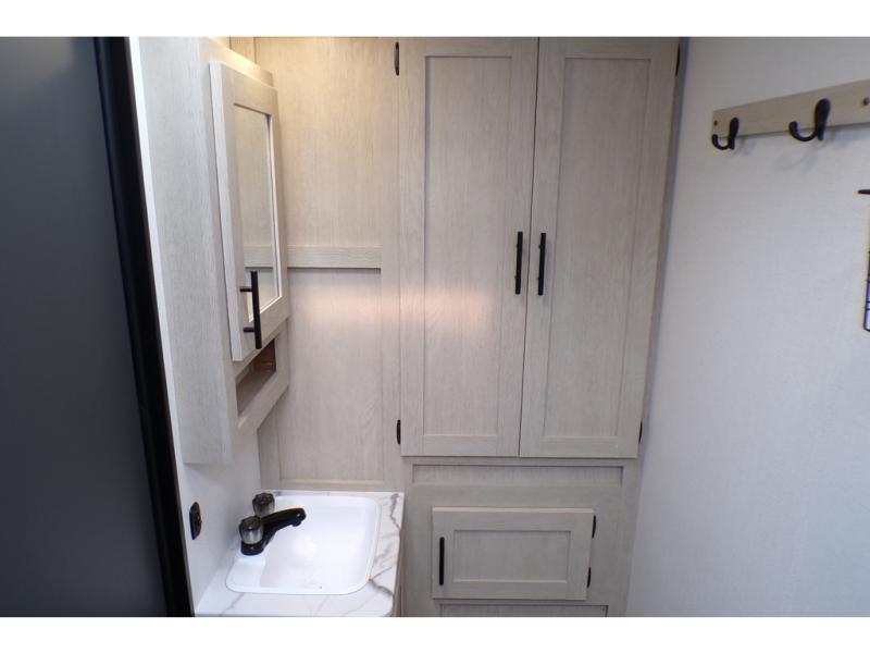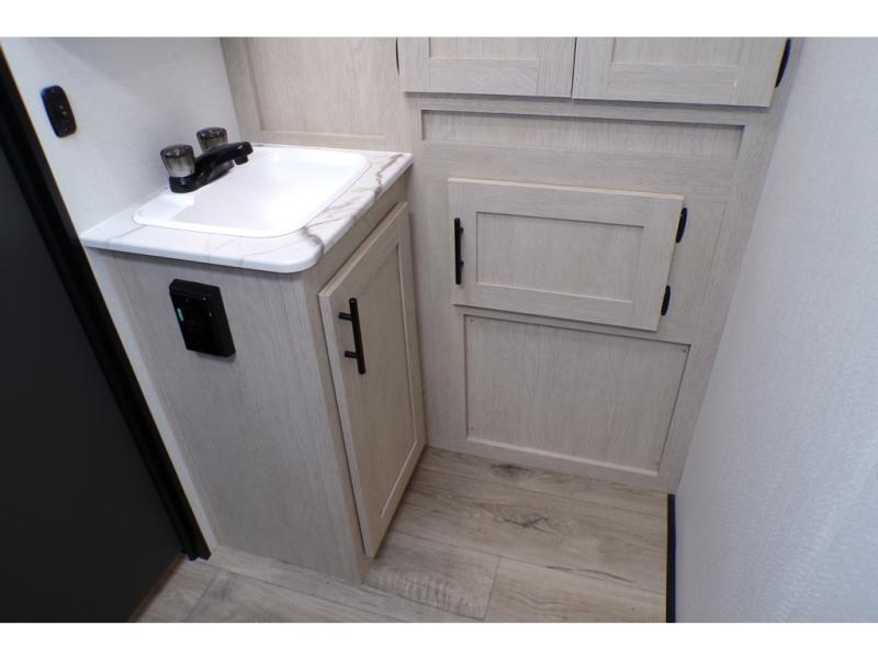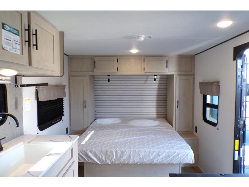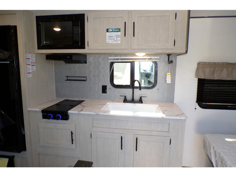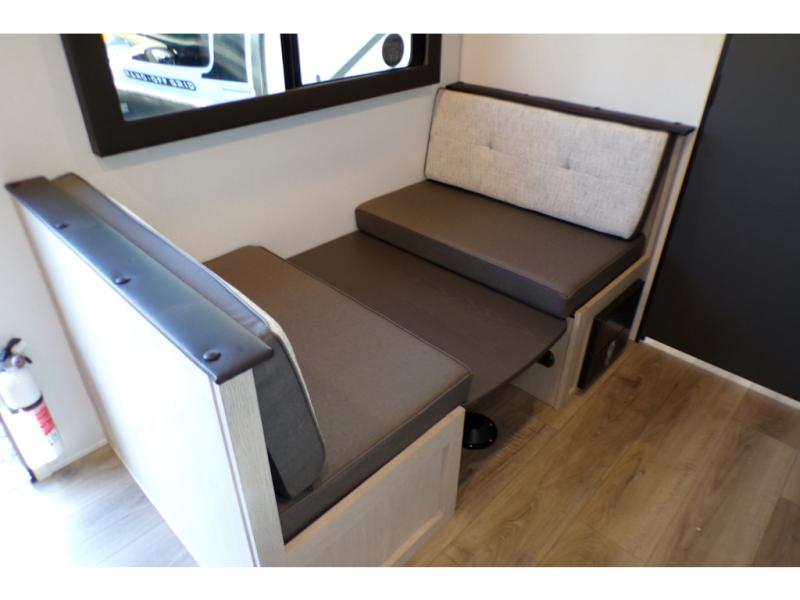 This travel trailer will feel just like home since there is a front bedroom with a queen bed, dual wardrobes to keep your clothes tidy, plus a spacious full rear bath. There is a shower pan here, plus a medicine cabinet and a spacious bath linen closet to keep clean towels close by. Head to the kitchen to prepare lunch on the two burner cooktop or use the microwave cabinet to heat up leftovers. There is a booth dinette where you can dine together and even let an overnight guests or two littles ones sleep on!