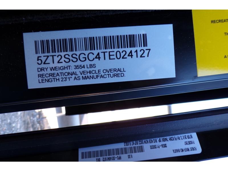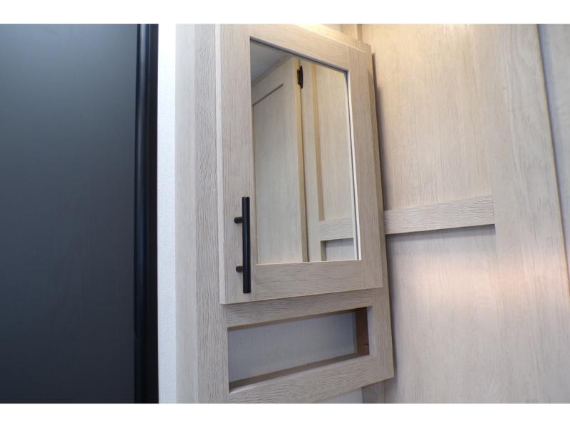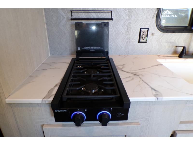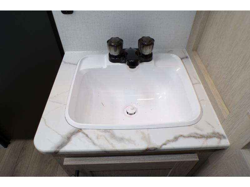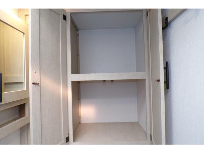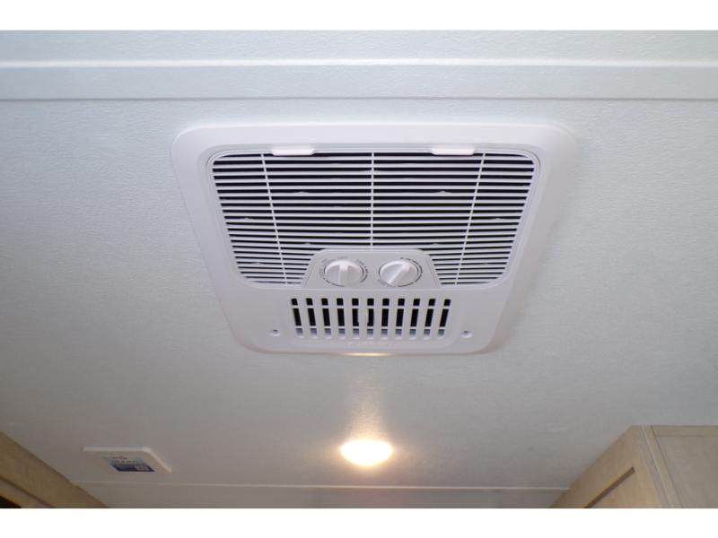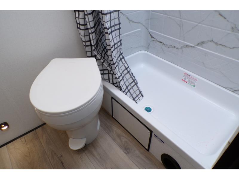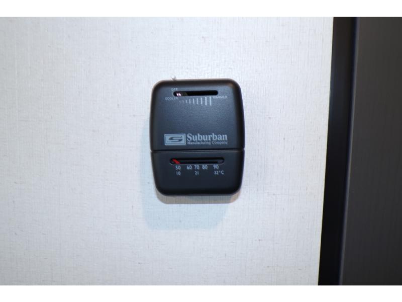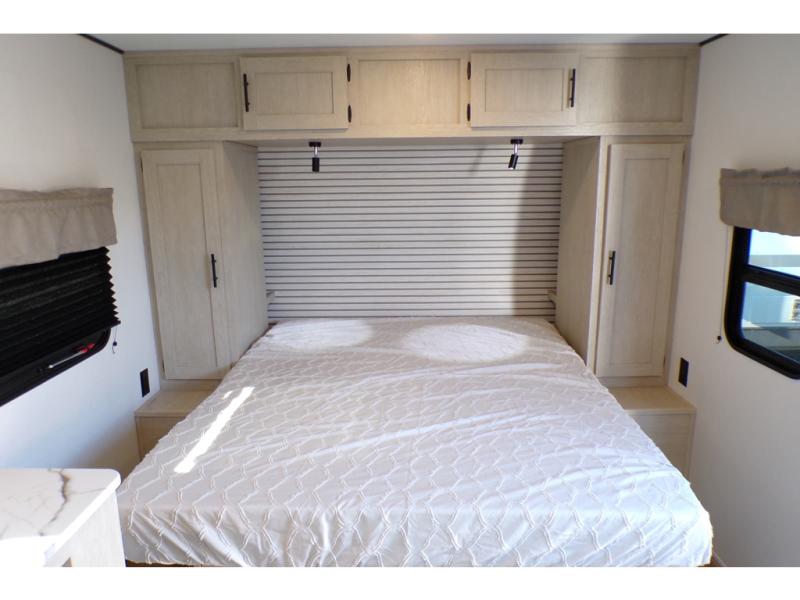 This travel trailer will feel just like home since there is a front bedroom with a queen bed, dual wardrobes to keep your clothes tidy, plus a spacious full rear bath. There is a shower pan here, plus a medicine cabinet and a spacious bath linen closet to keep clean towels close by. Head to the kitchen to prepare lunch on the two burner cooktop or use the microwave cabinet to heat up leftovers. There is a booth dinette where you can dine together and even let an overnight guests or two littles ones sleep on!