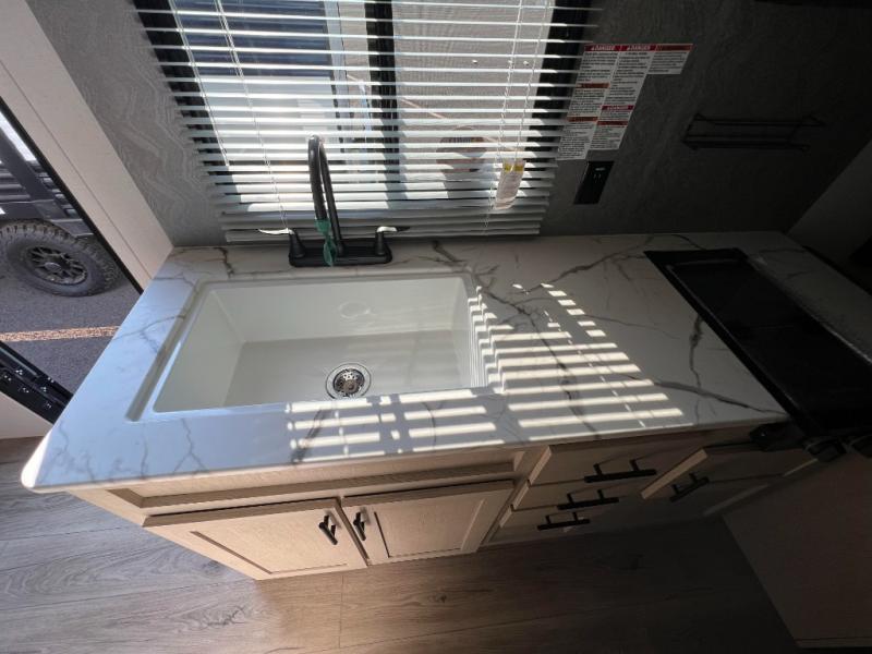 In any Shasta i-5 Edition travel trailer, you will find quality craftsmanship along with an affordable price tag. These units each feature four stabilizer jacks to make setting up easier and an enclosed underbelly for added protection as you travel. The Base Camp Package provides each unit with black tank flush, a monitor panel for quick access to the functions of your unit, a 13.5K A/C unit, and a tankless water heater for added convenience. Inside, you'll find seamless countertops, sink covers, a portable Bluetooth speaker, and more comforts!